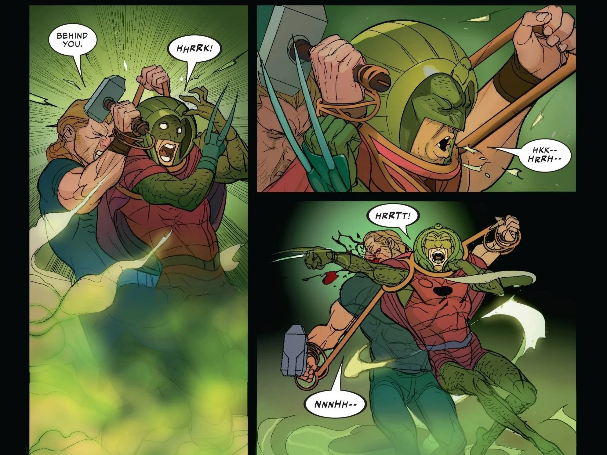 The Cobra, who would be rightfully laughed at for such a goofy costume in almost any other circumstance, is portrayed as a cunning and deadly force that could probably slay Sigurd outright if he were not so focused on toying with him. The sickly green color from the Cobra Gas bomb pops off the page. It almost makes me ill looking at it (this is a compliment, by the way). We also see more of the bungee hammer in action. This is a really cool nod to Mjolnir always returning to the hand of Thor, but it is reimagined to fit in the world of Sigurd Jarlson, where he is only just now fighting an actual supervillain. More than that, we get a full gamut of expressive and emotive panels from Sigurd that let us really know what he is feeling, even when he is swearing in Norwegian.