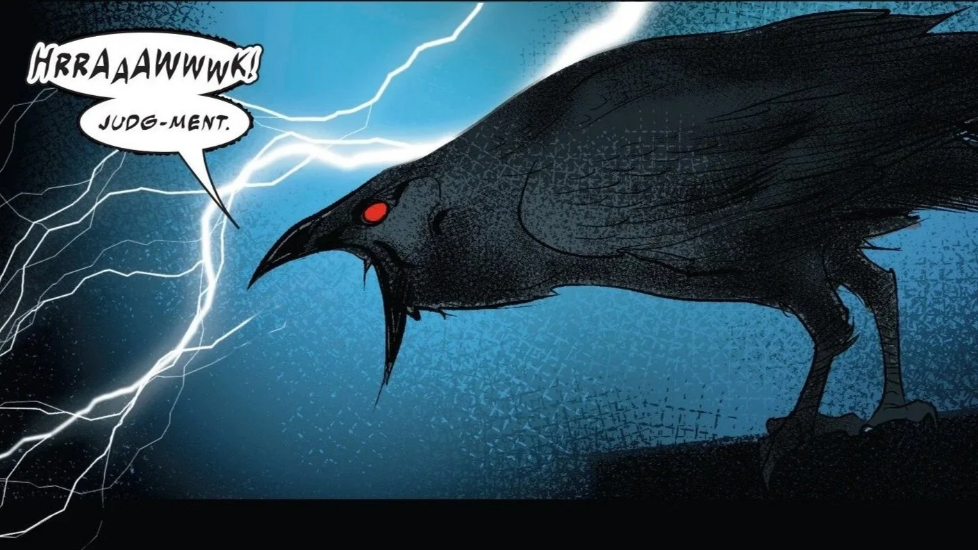 We witness a raven cry out "judgment" as we are met with the image of the cagey as ever Odin perched on a rooftop, apparently observing the events unfolding. Despite no longer being the All-Father (or technically alive), he has a vested interest in Sigurd and what path he would take. In his musings, Odin acknowledges that he created Blake. He admits that despite Blake being twisted and damned, he still works a piece of the will of Odin. This is to be one of three judgments that lie in store for him.