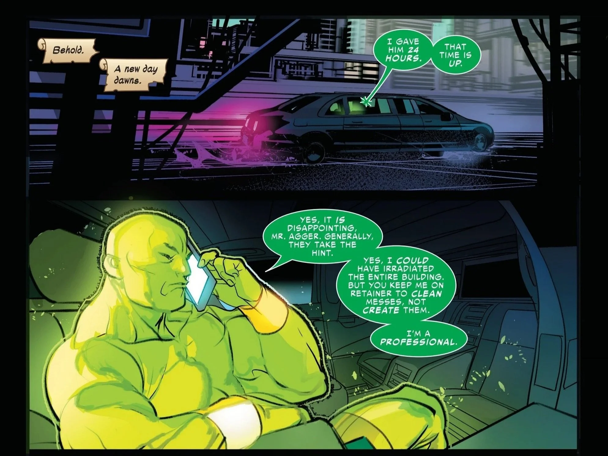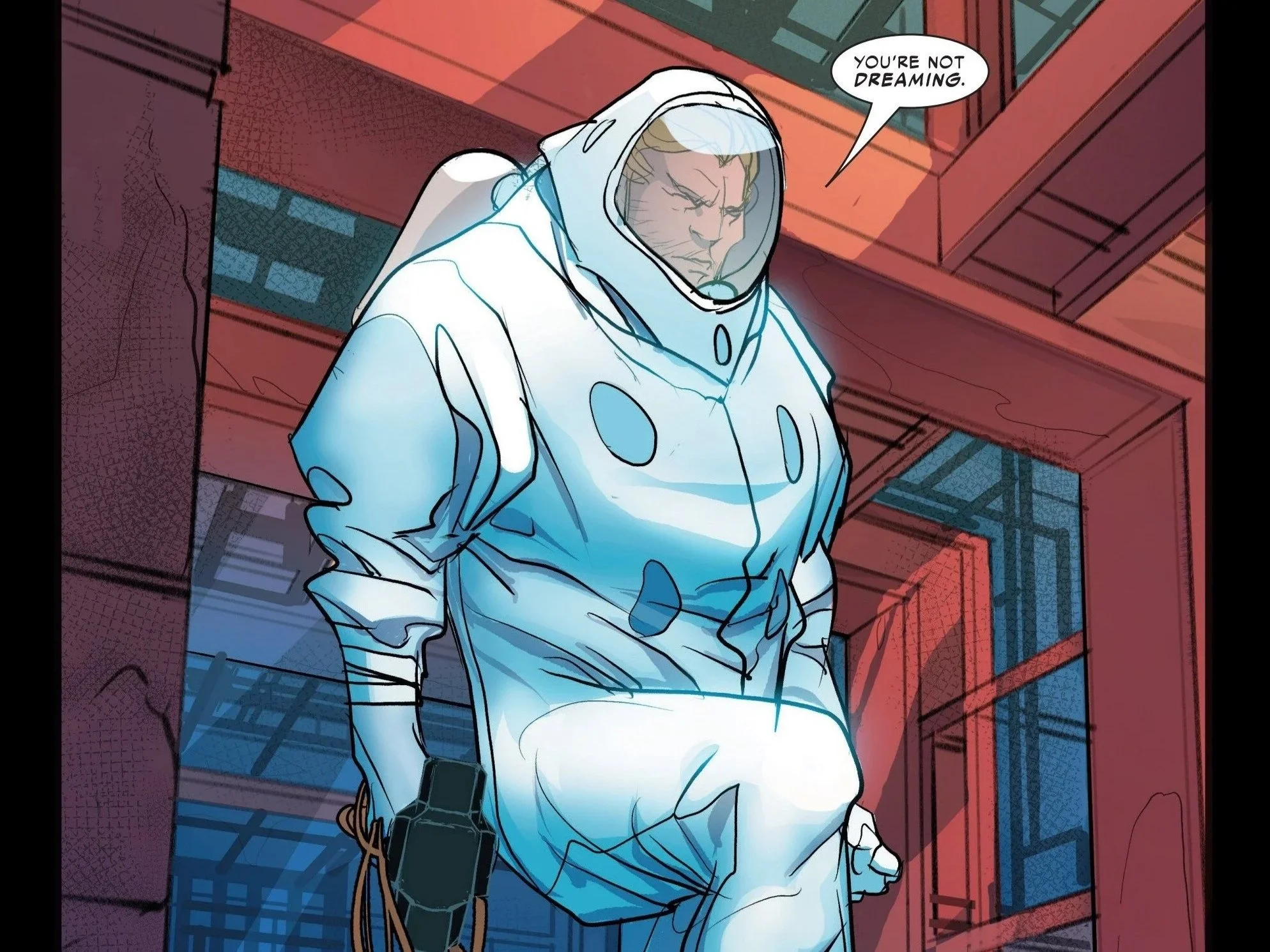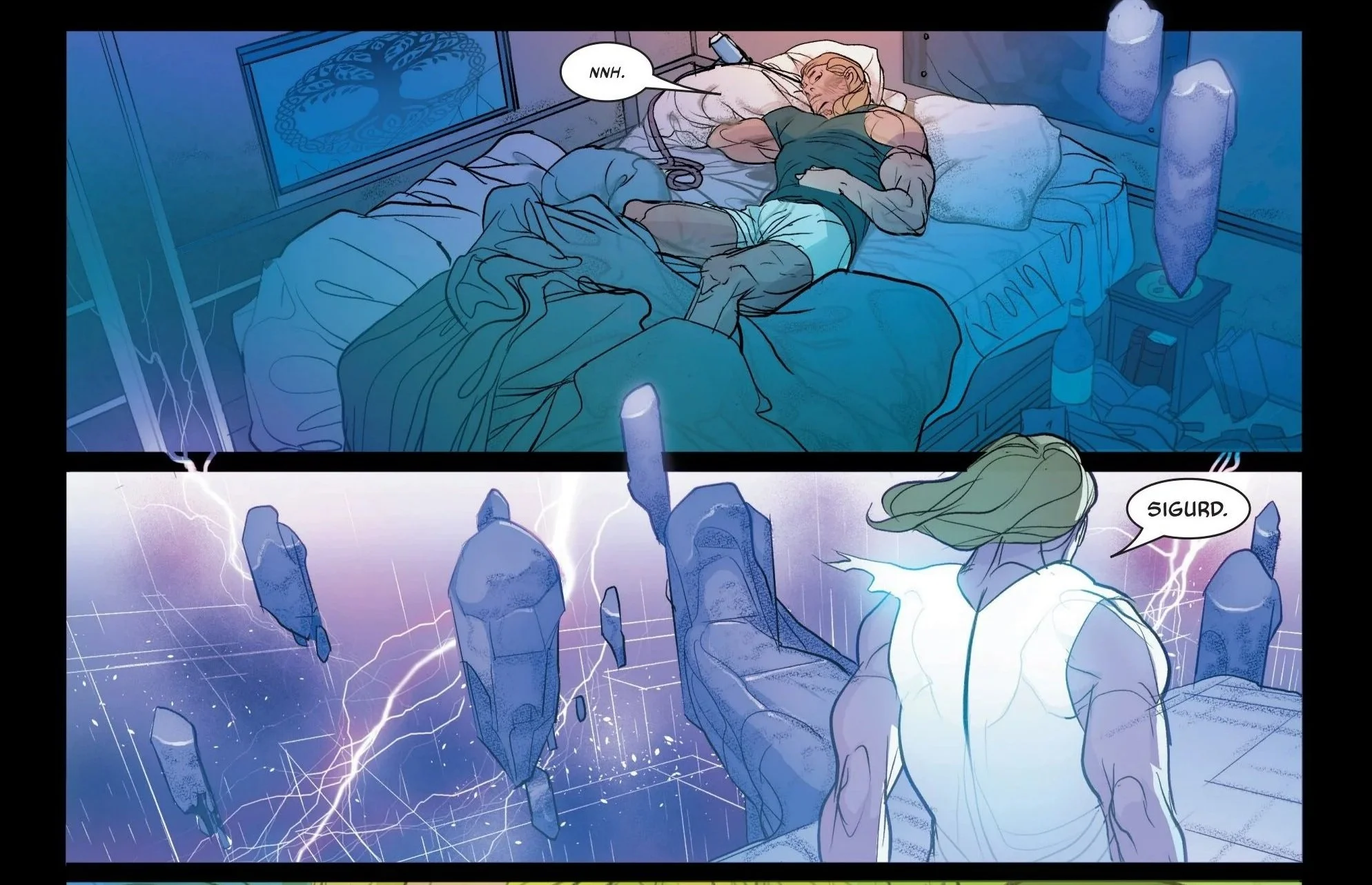 We begin with Sigurd fast asleep in bed as he’s visited by the spirit of Thor, who remains very much dead and in the void. He offers a simple but succinct warning: there are some things you cannot fight. As if to make Thor’s point abundantly clear, Sigurd is awoken by the very brightly glowing figure of Dr. Chen Lu, better known as the Radioactive Man. Still groggy, Sigurd asks who he is as the supervillain cordially engages in conversation with the man while helping himself to his coffee. Chen Lu explains that he’s been hired by Roxxon to solve the problem that Sigurd has become. He makes it a point to apologize for the white supremacists, cultists, cheap mercenary, and psychotic killer that have been assigned to “deal” with him as he fashions himself a professional. Sigurd lashes out with his hammer, assuming he’s been sent by Blake. But Radioactive Man easily catches the hammer and proceeds to melt it in his grasp. He explains that he’s been hired to remove him from the equation, but how he does so is up to him. Like a true gentleman villain, he takes the melted hammer (no longer safe for Sigurd to have) and promptly tells him to leave New York City in 24 hours or he and everyone near him will die terrible deaths. He reiterates that he has been hired by someone who outranks Blake and that should Sigurd not leave, their next encounter won’t be nearly as pleasant. He takes his leave (having destroyed Sigurd’s door) as he leaves the amnesiac Norwegian with his ultimatum.