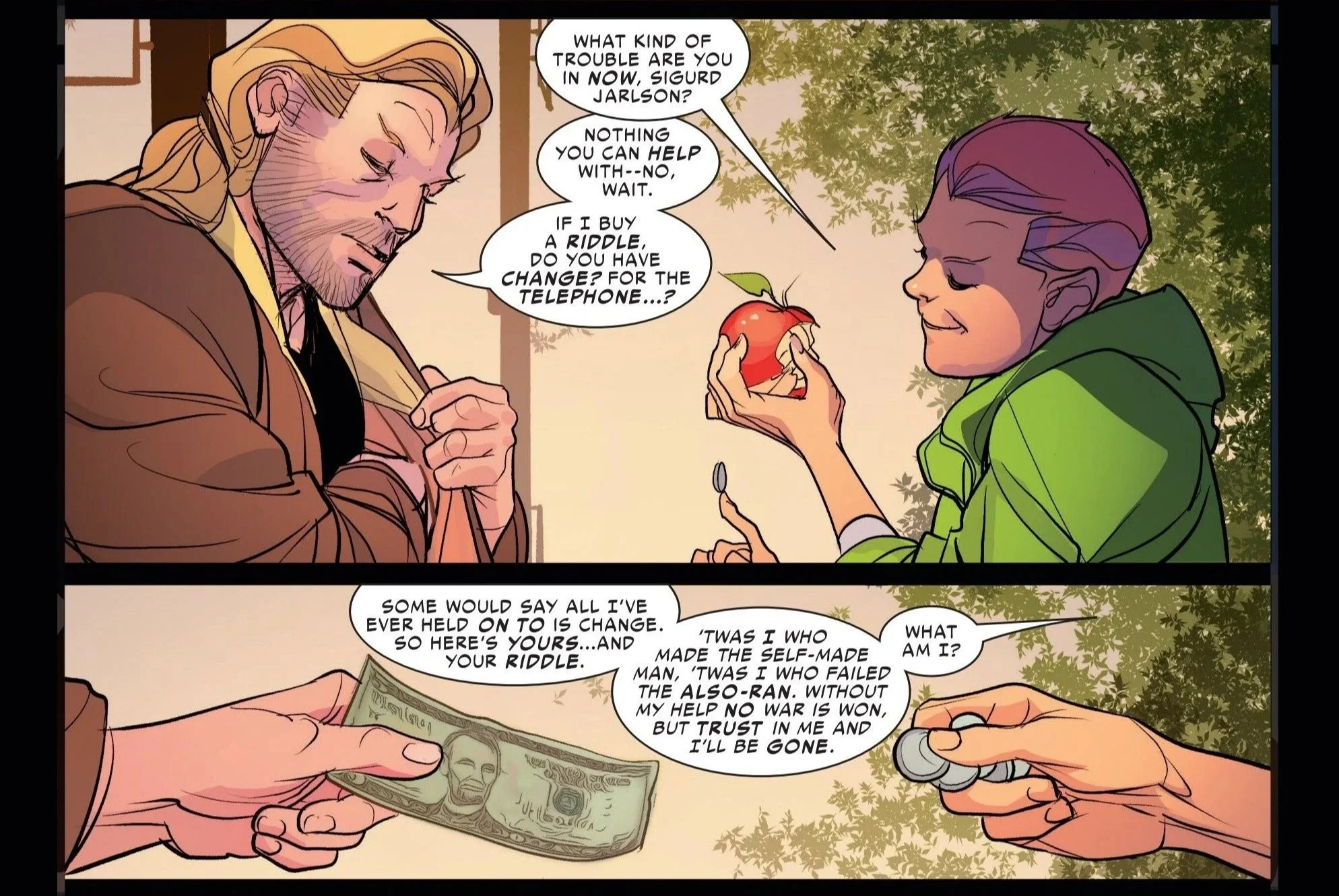 Sigurd buys one of Lucky’s riddles, but only to break change.