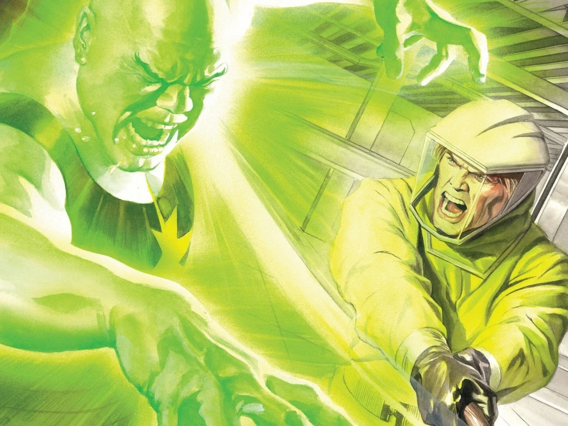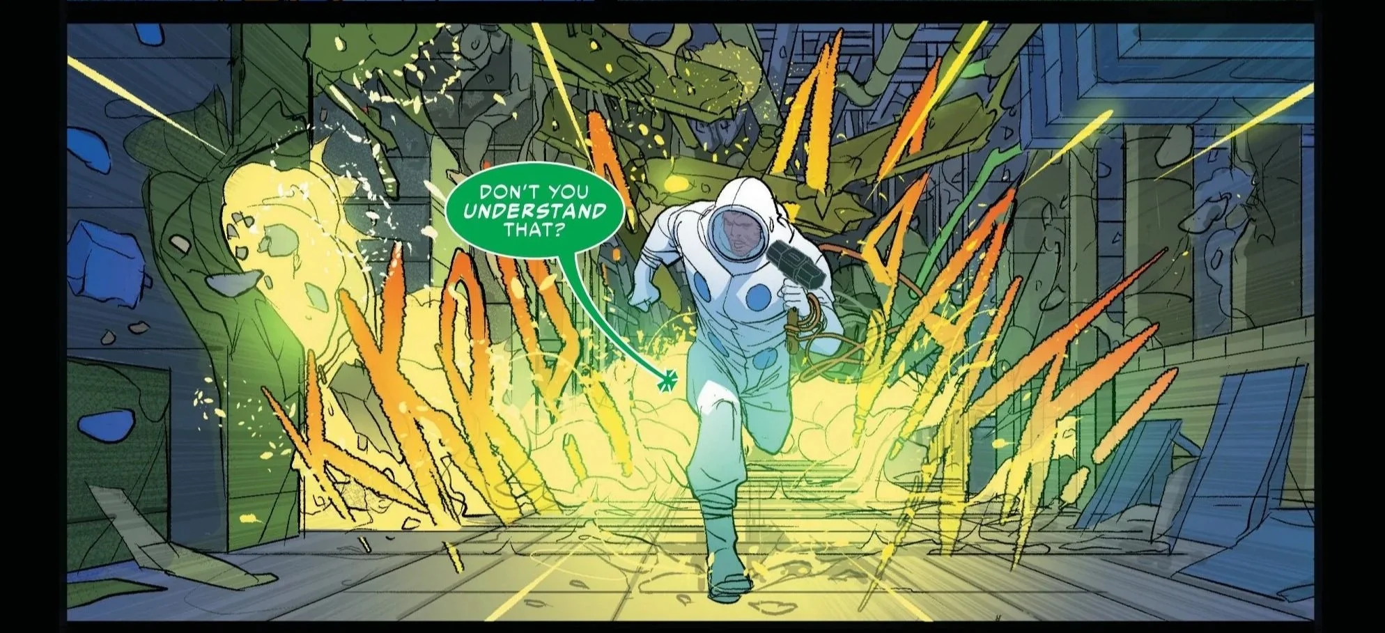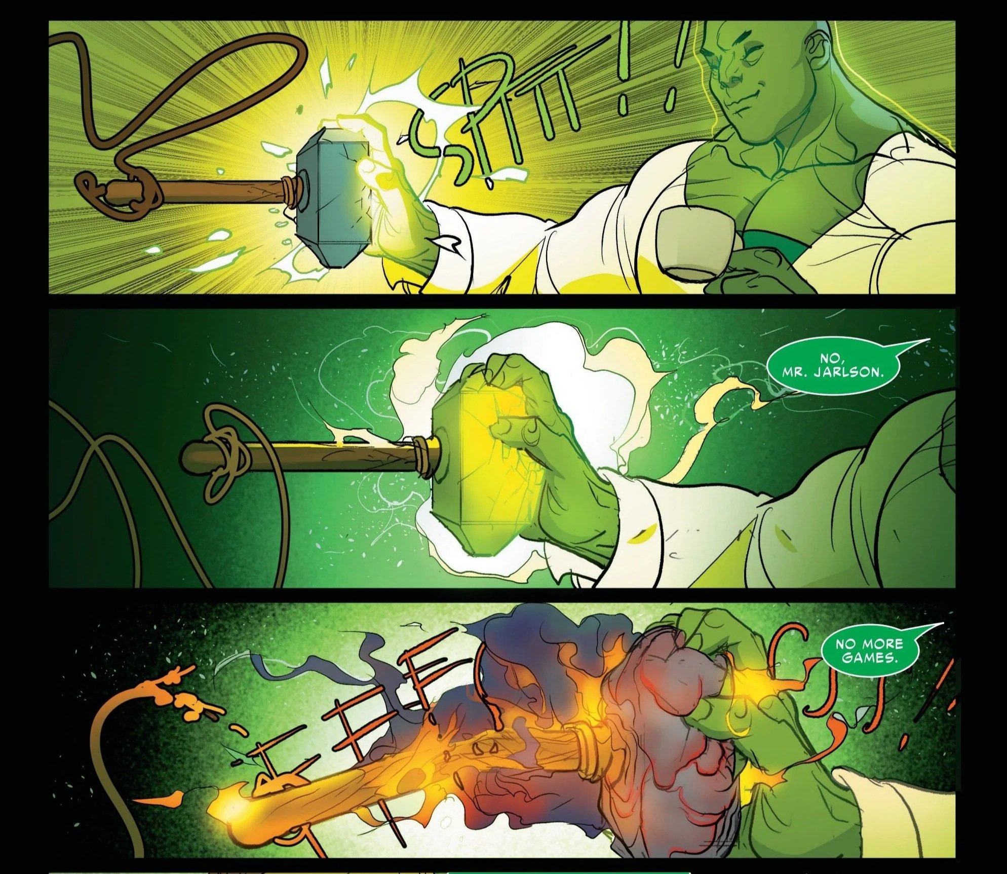 The art here, courtesy of series regular Pasqual Ferry, in turn joined by colors thanks to Matt Milla, gives us a thrilling visual display, namely in the form of the issue’s featured antagonist, Radioactive Man. It’s not so much that he’s a six-foot-tall green glowing supervillain, but the relaxed body language that stands out in this book. When we first see Chen Lu, he’s just casually speaking to Sigurd in an almost friendly conversational tone, and the art conveys that with his softened expression and smile. Which makes the next time we see him a jarring about-face as he’s firing lethal energy blasts and is anything but a polite stranger. The various shades of green and yellow really accentuate the fact that this guy isn’t just shooting random blasts but rather concentrated doses of radiation that would instantly kill a person. It looks great on the page, and the tight panel spacing and equally quickly paced writing help elevate the art beyond its already consistently high quality. Having come off the previous issue - in which the focus was specifically on Asgard and Magni - I further appreciate how the primary Sigurd-based issues feel distinctly grounded and gritty, even when dealing with men who are glowing with radioactive energy.