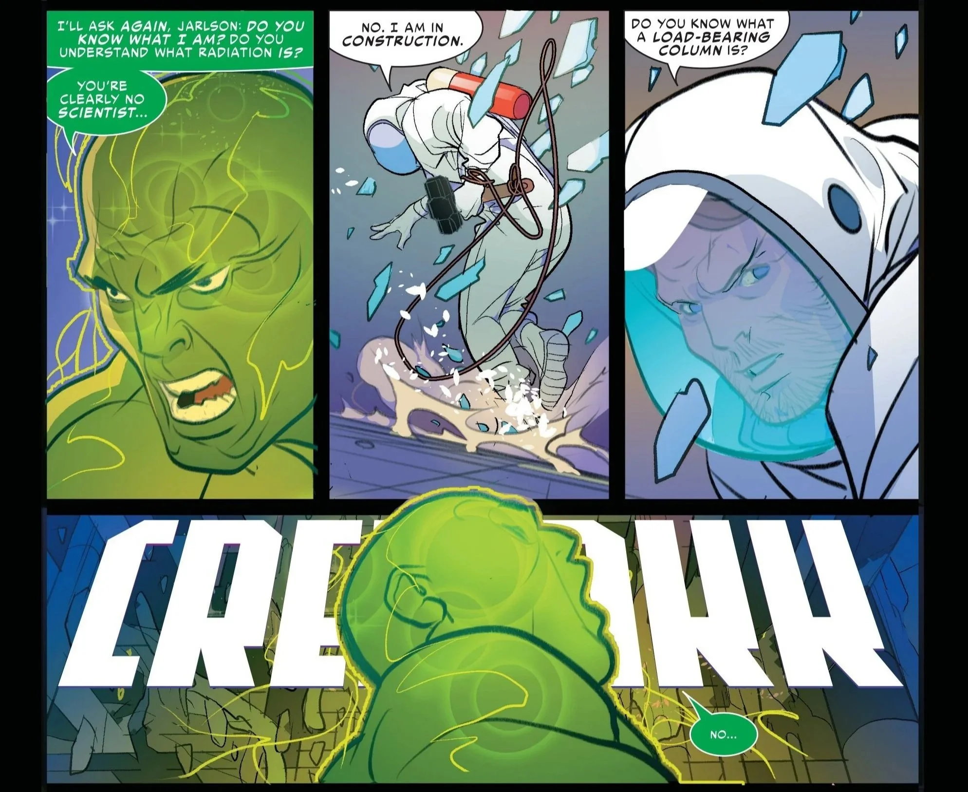 Radioactive Man keeps his composure as he stalks Sigurd through the warehouse, telling him that the death he’s earned will be painful and slow. He winds up blasting at Sigurd several times, narrowly missing him as his frustration builds. Eventually, he bellows out at the hammer throwing man, telling him that he’s inevitable and asking him if he understands what he is and if he understands what radiation actually is. Clearly he is no scientist. Sigurd leaps out of the nearest window as he informs him he’s in construction before asking Radioactive Man if he knows what a load bearing column is. Radioactive Man has only but a moment to realize what’s happening as the entire building collapses on him, burying him in rubble.