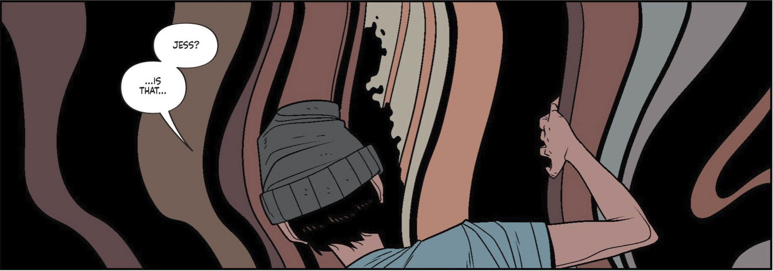 Marcus is unable to unlock his door because it’s stuck, therefore he can’t get into the apartment complex corridor, leaving Jess by herself against whoever it is that’s after her. The last two words Wagner shows us from Jess are, “Marcus…”, “…please.” We’re then left with a bloody Jess that you can see from Marcus’ point of view, and Marcus blacks out again. Oh man this opens up so many theories of what I think is going on in this story, with Marcus, his environment, it’s like a reader’s dream. Wagner has got me fully hooked, line and sinker into what looks like a terrifically mysterious story to be told.