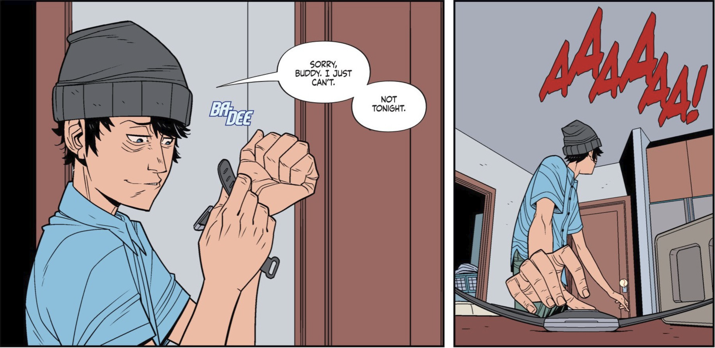 My favourite scene from Narco #1 is where Marcus is getting prepared for his big date with Jess; the panel work is sensational. I’ll go so far to say that it’s some of the best and most intelligent panel work I’ve seen in my readings; the way that Hillyard draws Marcus’ actions by using the rooms as panels is phenomenal. It really made me as a reader be transported in my mind’s eye to doing the exact same ritual when going on big dates, which was super fun to go through.