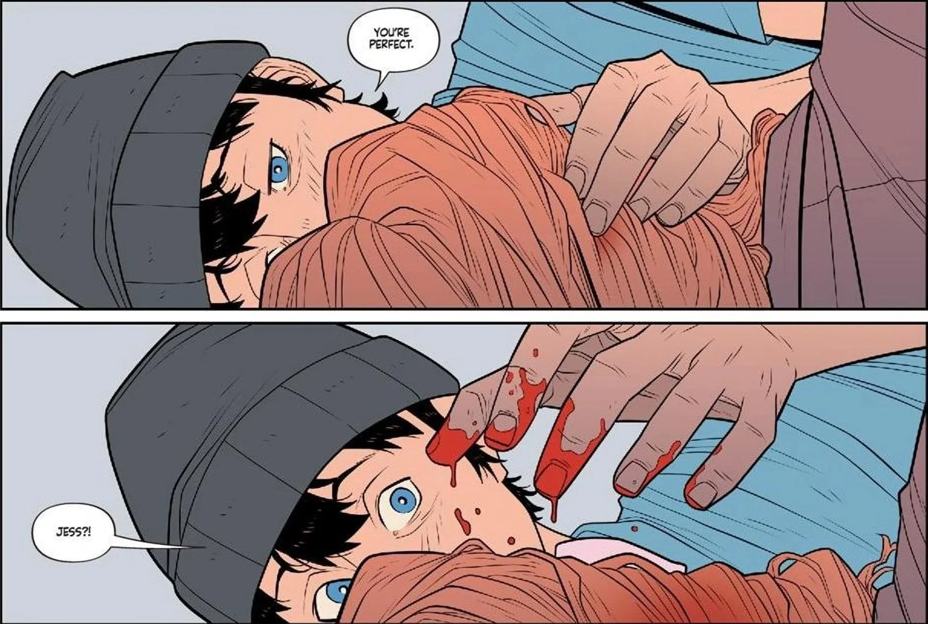 The issue opens exactly where it needs to, with Marcus waking up next to Jess’s body. This is the moment that the first issue was building toward, and it would have been easy for it to be framed as a shocking, high-intensity reveal. Instead, the scene is handled in a much quieter and more unsettling way that fits the tone of the series far better.