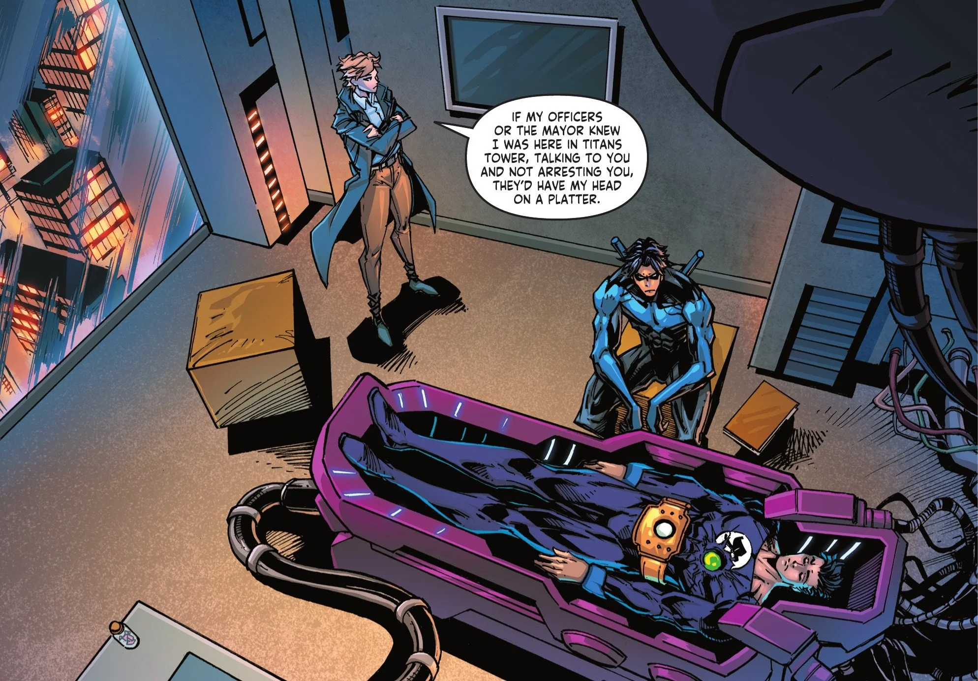 He continues to sit at the bedside of Nightwing Prime, who has not healed from his Kryptonite blast. Nightwing tunes out the world, waiting patiently and quietly, mentally trying to make heads (no pun intended) or tails of the situation. His entire world has been turned upside down in the matter of a single night. Detective Maggie Sawyer sits with him, seeking answers as well.