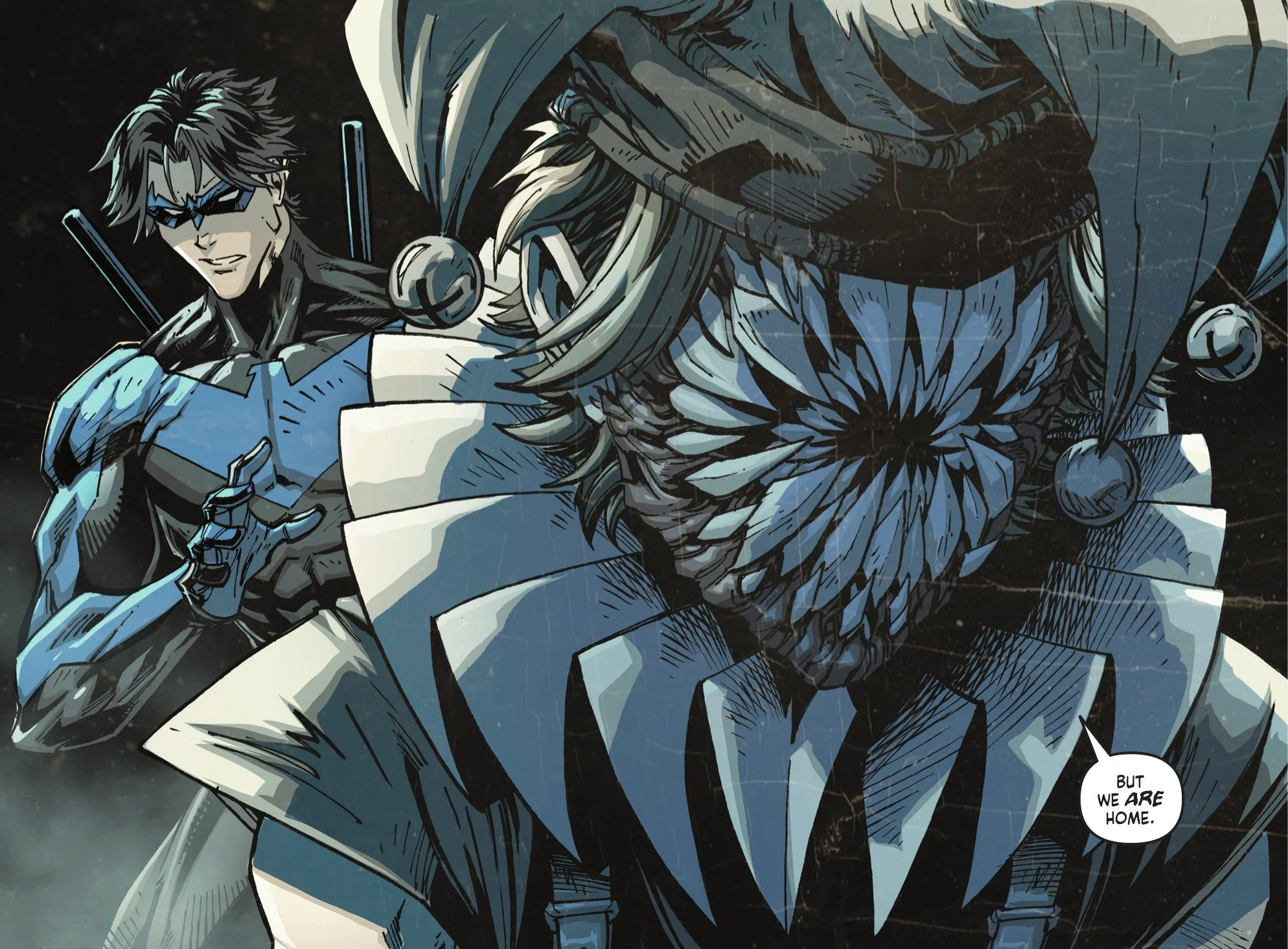 Nightwing accepts the terms and is brought to the Cirque Du Sin. Even Zanni notices that Nightwing is in his element, smiling as the hero drops into the middle of the evil carnival without any idea of the horrors to come. This includes a confrontation with demonic girls—possessing faces made entirely of teeth—who look like they were pulled straight out of a Spawn comic as they attack him.
