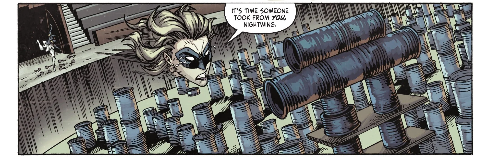 The scenic shots of Blüdhaven by Ken look phenomenal as well. The way he transitions from the angle of the cans to the real-life buildings that are being destroyed is a great visual. His expressions are all phenomenal, too. Whether the character is shocked, scared, or angry, you can feel their emotion. The close-up shot of Zanni as Nightwing throws the soup ball of Nite-Mite at him is a great example.