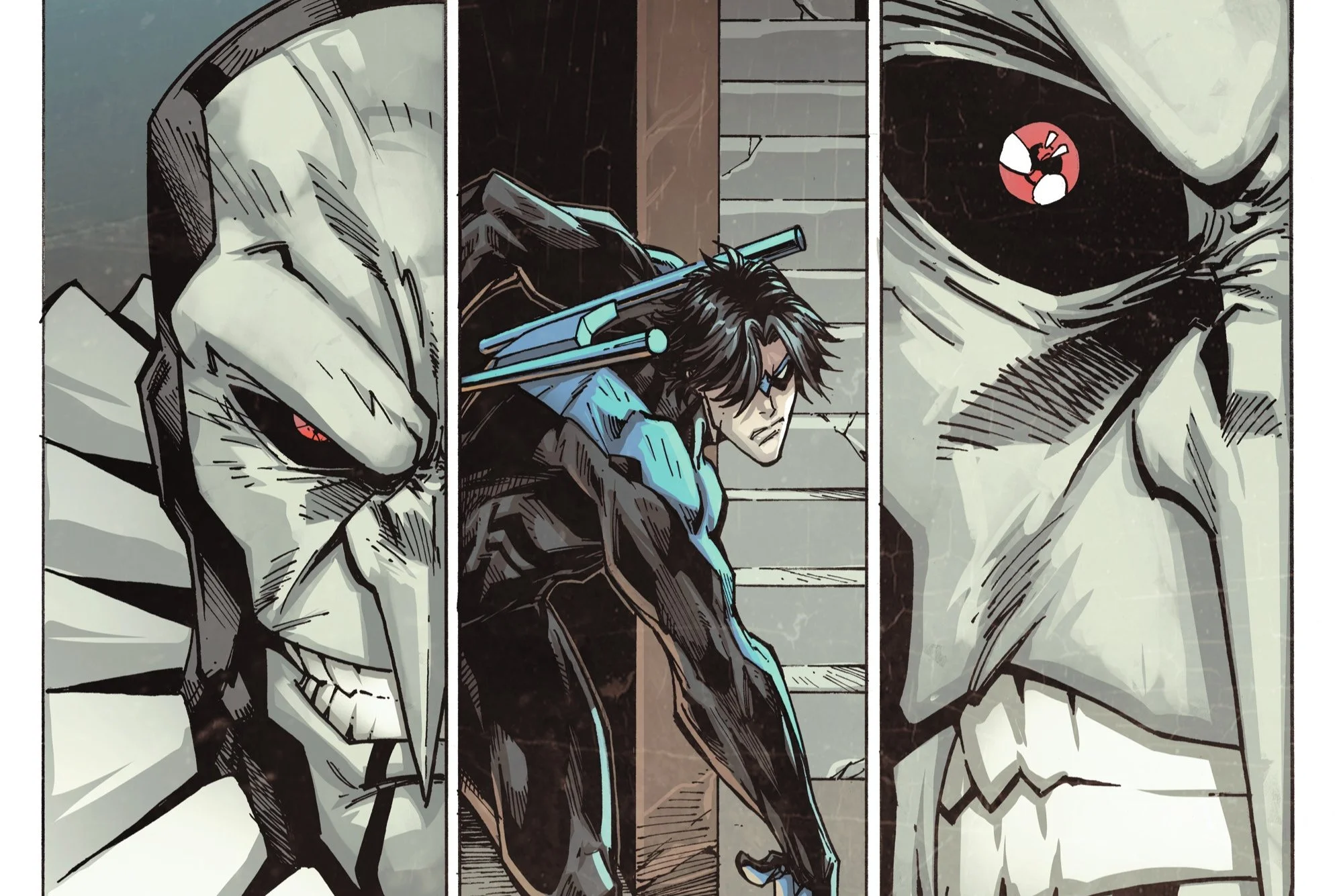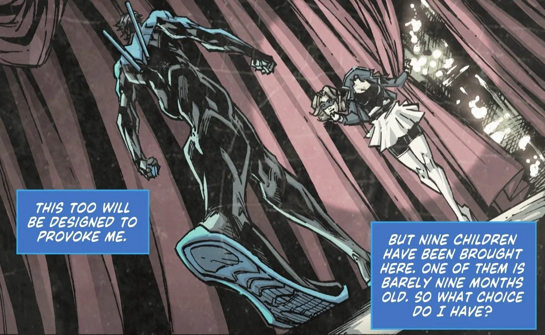 As they stand on watch in Blüdhaven, Nightwing has entered the tent at the Cirque Du Sin. He is being led by the headless Olivia Pearce. He finally stands in the same vicinity of Zanni, who taunts Nightwing with the doll creations of the trapped children. He strikes a deal with him.