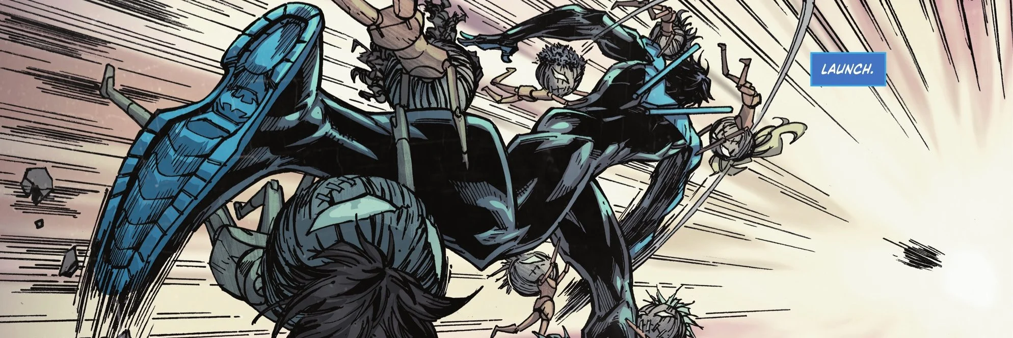 To try and motivate Nightwing, Zanni launches the doll-like children at him. They climb and gnaw at his body, causing painful distractions while Nightwing tries to focus. He extends his arm back and launches the ball forward.