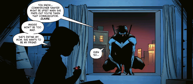 That same night Nightwing goes to visit Claire, the daughter of Commissioner Sawyer's girlfriend who stole her communicator to call Nightwing. She wants to tell him that someone wanted her to tell Nightwing that he's okay. Nightwing is confused before she explains that every time the Zanni tries to scare the children in their dreams, he's being followed and stopped. He's stopped a hero that all her friends are talking about it at school. Nightwing Prime. And Prime told her to tell Nightwing that he's okay and he's keeping Zanni locked away from hurting anyone else. He's happy.