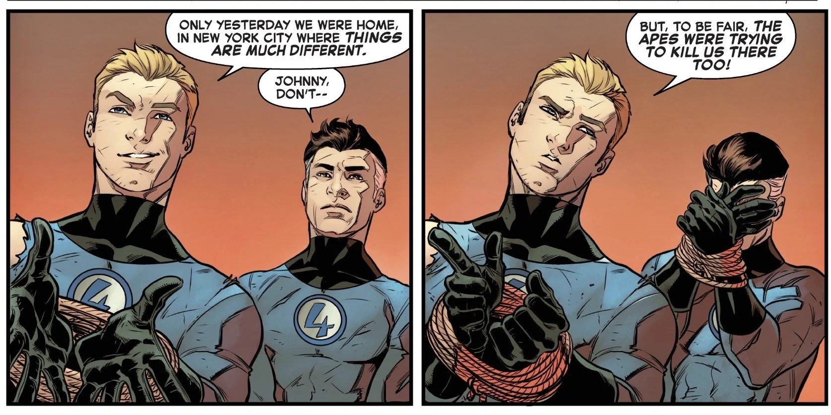 This isn’t going to change the world or your life, and you’re probably not going to remember it for years to come—but as long as you enjoy it in the moment, isn’t that enough? I read comics to escape the world we live in, and you can’t get much further away than "a cosmically powered quartet ends up on an Earth overrun by sentient apes, where they lose their powers and are taken prisoner." There is not one word in that sentence I can relate to, and that is A-okay. (Okay, I can relate to the word "Earth," but why quibble?)