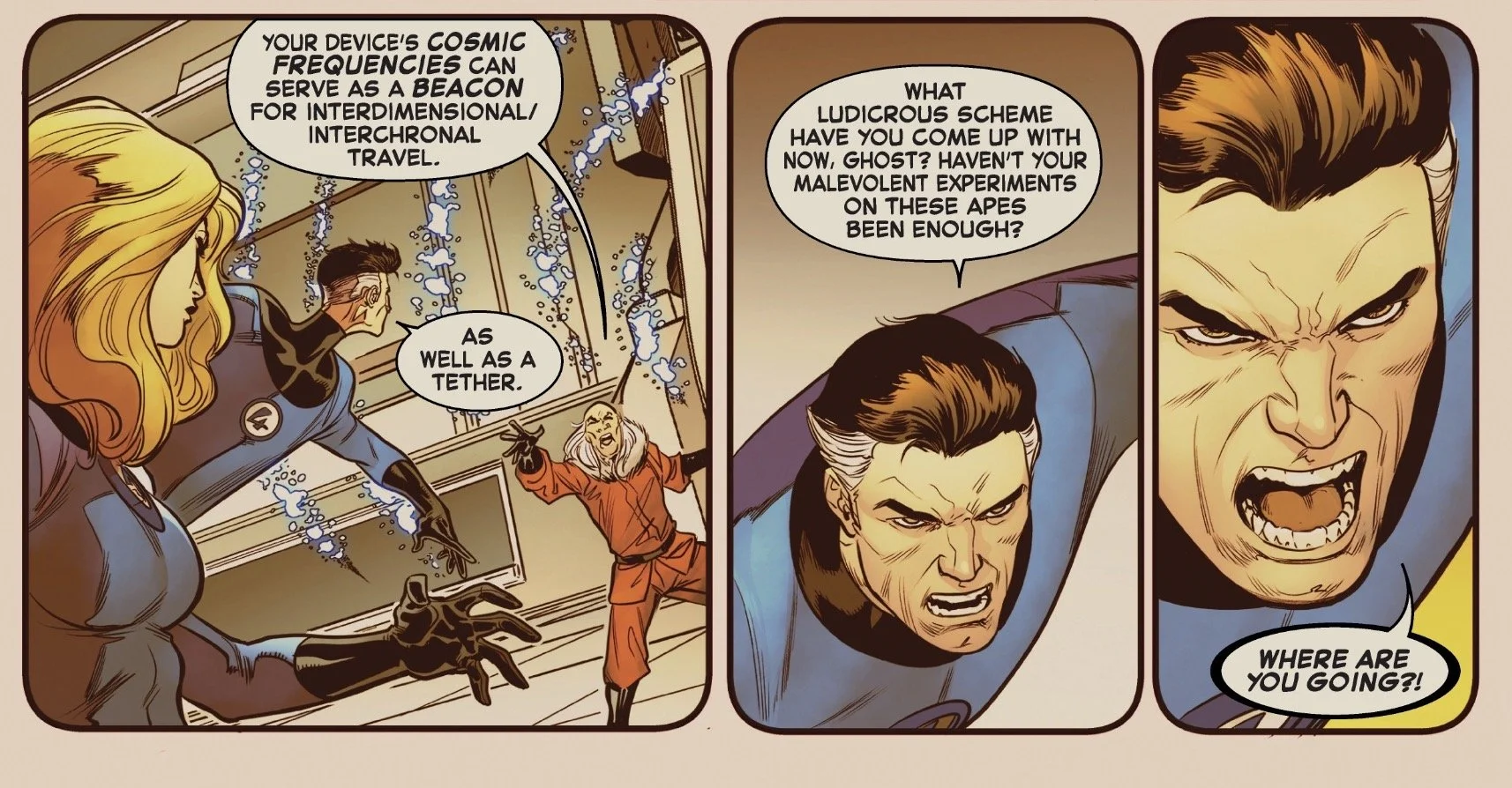 The chaos began just yesterday, when the FF were facing the Red Ghost and his Super-Apes, who had dared to invade the Baxter Building. Red Ghost was attempting to hijack one of Reed’s inventions, babbling about "worlds only being aligned for so long." Soon, it was Ben Grimm’s (and CM Punk’s) favorite time—it’s "clobbering time," for the uninitiated—and in the ensuing melee, the FF were pulled through a dimensional gateway.