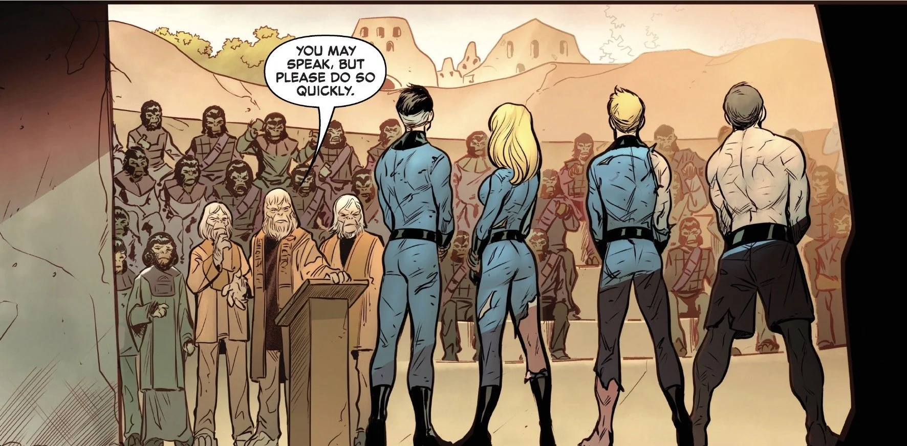 After a quick introduction from everyone's favorite cosmic observer, Uatu the Watcher, we dive right into the thick of things. The Fantastic Four are powerless, imprisoned, and facing trial before the ruling council of the Planet of the Apes. To put it mildly, it’s not going well.
