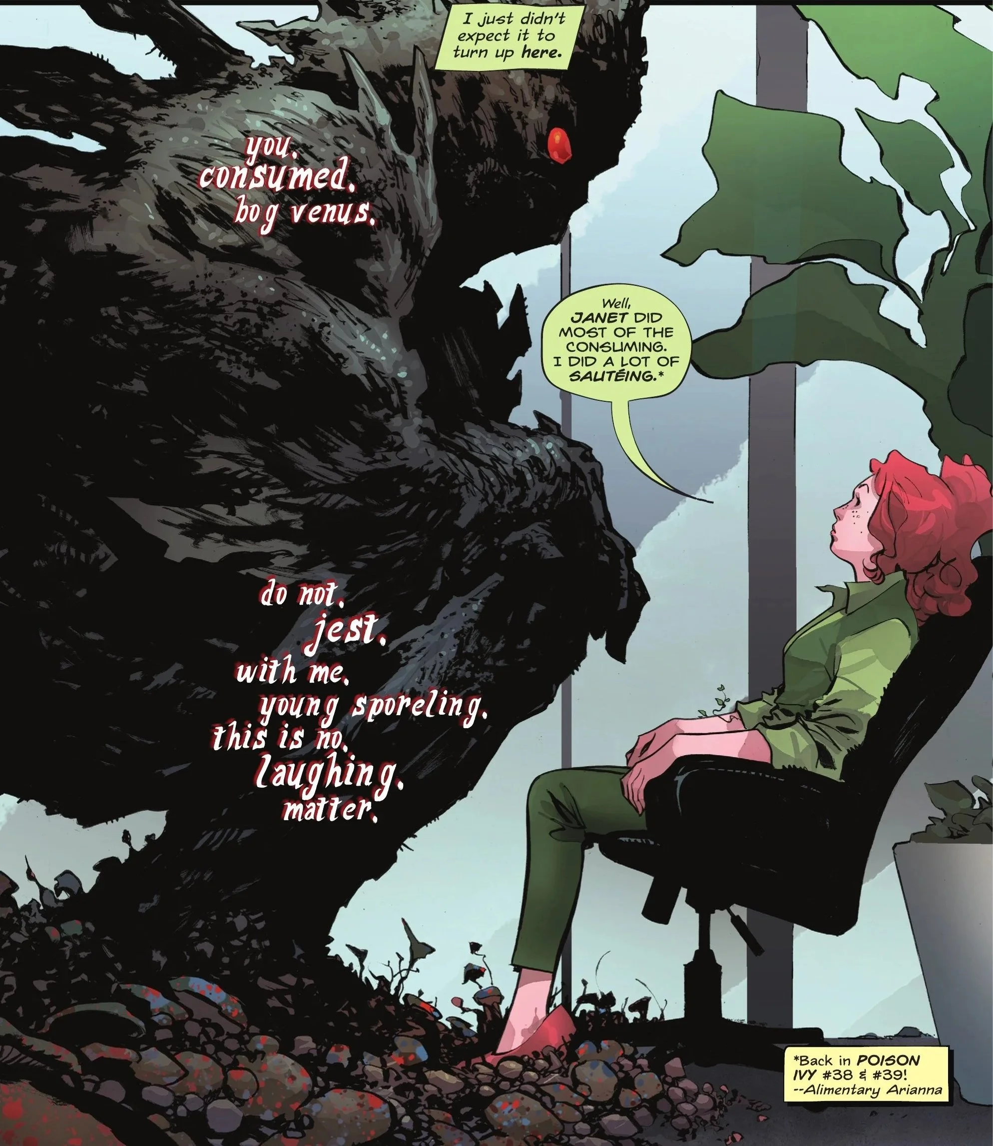 Xylon confronts Ivy about a shocking act from earlier issues involving Bog Venus, a being tied to the Green. According to him, Ivy was meant to serve as an ambassador between the Green and the Grey, with the goal of potentially ending an ancient conflict between the two forces.