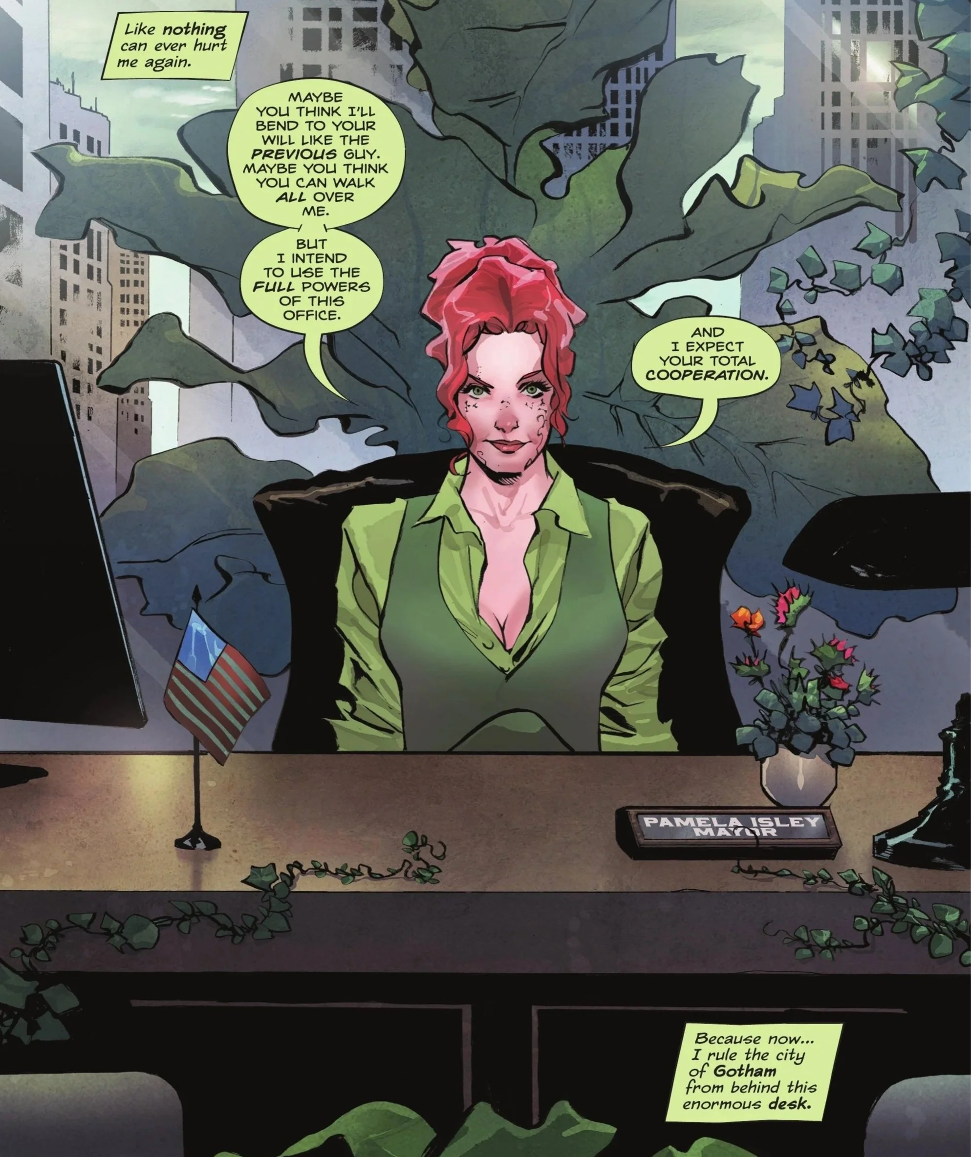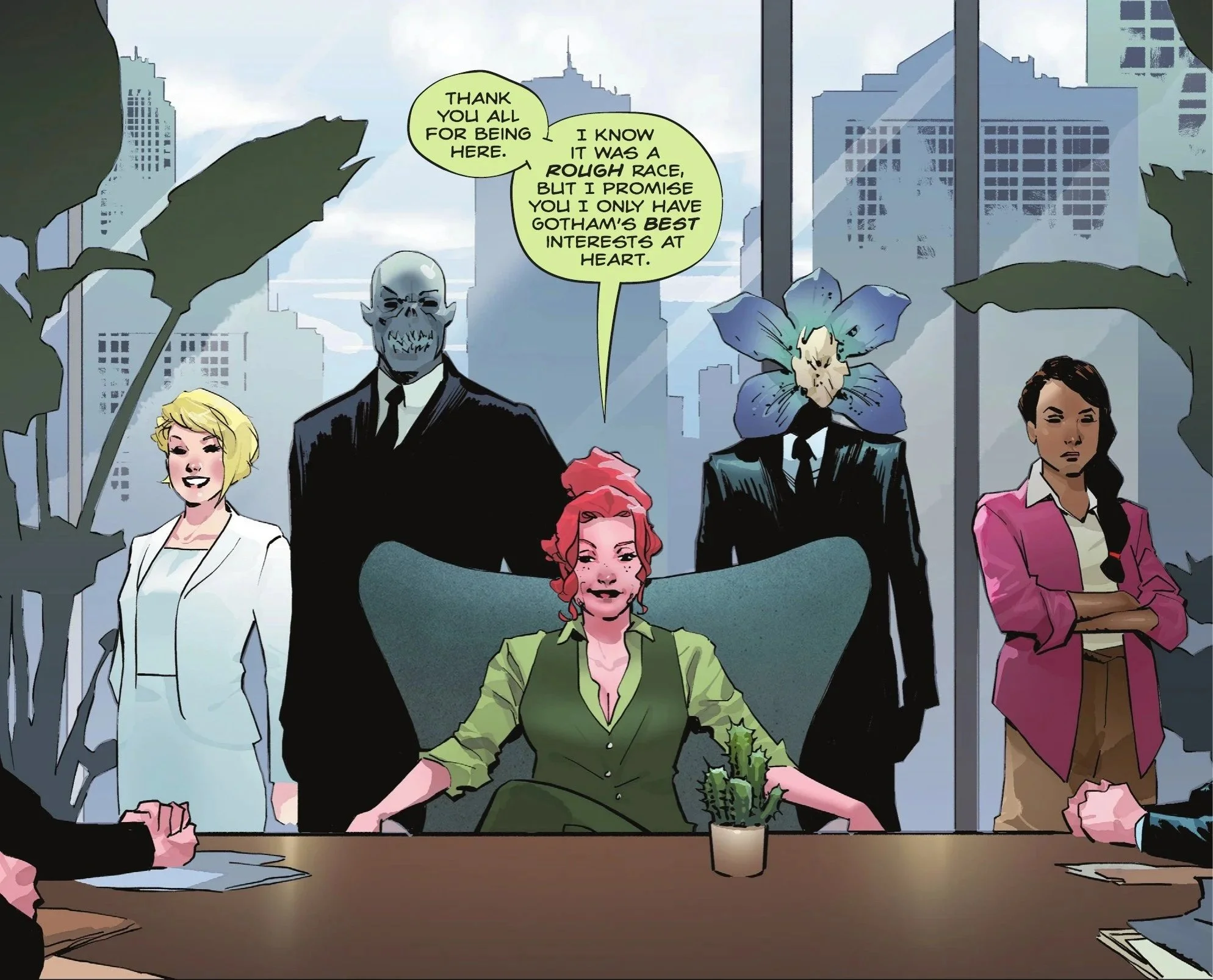 The issue opens with a jarring yet fascinating development: Ivy is already seated as Gotham’s mayor. The previous installment left her in a jail cell holding a campaign flyer, so the sudden leap to City Hall immediately signals that something unusual has occurred behind the scenes.
