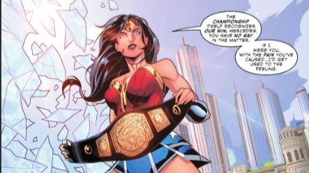 We pick up right where we left off in DC X AEW #1, with the Justice League Elite coming to terms with Mercedes Mone betraying them for the Intergalactic Championship belt, aided by Lex Luthor. As the news trickles down from the Watchtower to the rest of the JLE, the pairs of fighters finish up their assignments to regroup and help Aquaman.