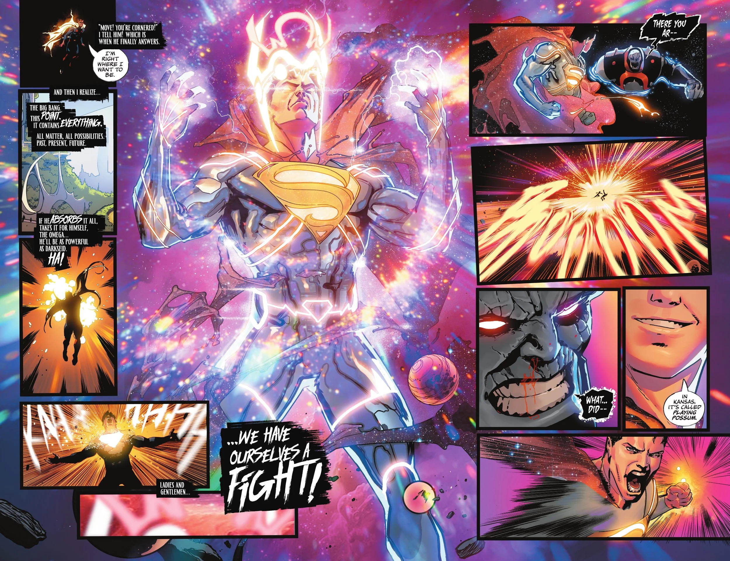 Superman really does get his moment to shine in some of these, lending some much-needed gravitas to the chaos – like a responsible adults making sure the party doesn’t burn down the house. Which would be fine any other time, but right now maybe the house does need to be torched and have something different built for once. When Snyder has every single page is cranking the stakes up to eleven, things stop building and start blurring together. There’s a lot of talk about Alpha Energy and Big Bang and Absolute Crises and this and that, but not a single concept feels like it was given enough room to breathe without feeling like a toddler throwing a handful of darts at the board: it’s scattered, innacurate and someone’s clearly going to get hurt. Decisive battles? Ha! Nothing’s decisive when the supposedly greatest stakes of them all are not just handwaved away by a Superman powered by creation energy x 100000000 (keep adding zeros), but that it turns out that there’s ALREADY a new crisis by Darkseid brewing at the end of this one.