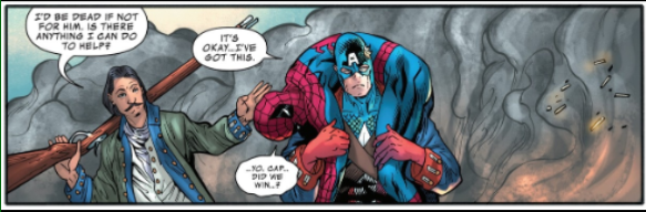 The next complaint is not necessarily a criticism of the creative direction of 1776 #4, but more of the use of tropes, specifically in comic books. Everything is coincidentally connected to the same people, and everyone is related. Everything seems to be aligned in a cosmic way, and everything is predetermined fate. There is a lineage that cannot be broken because it is the fates that bind all. Star Wars is like this, too. In this instance, Peter Parker saved his great-great-great-grandfather, Elias Parker, thereby preserving his family lineage. While it works as an emotional beat for the story, it is played out. When the issue is good and you have to find something wrong, it sticks out.