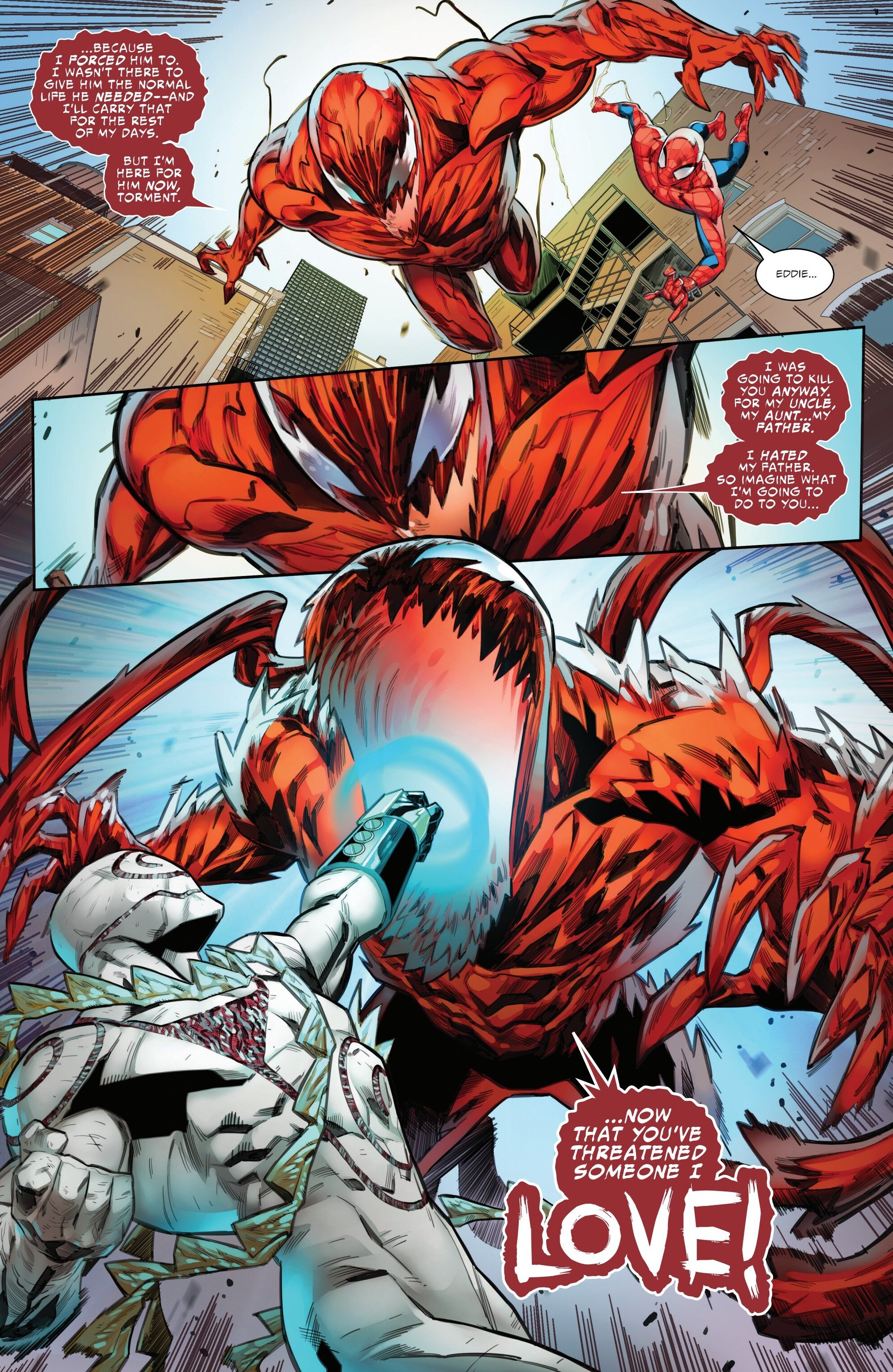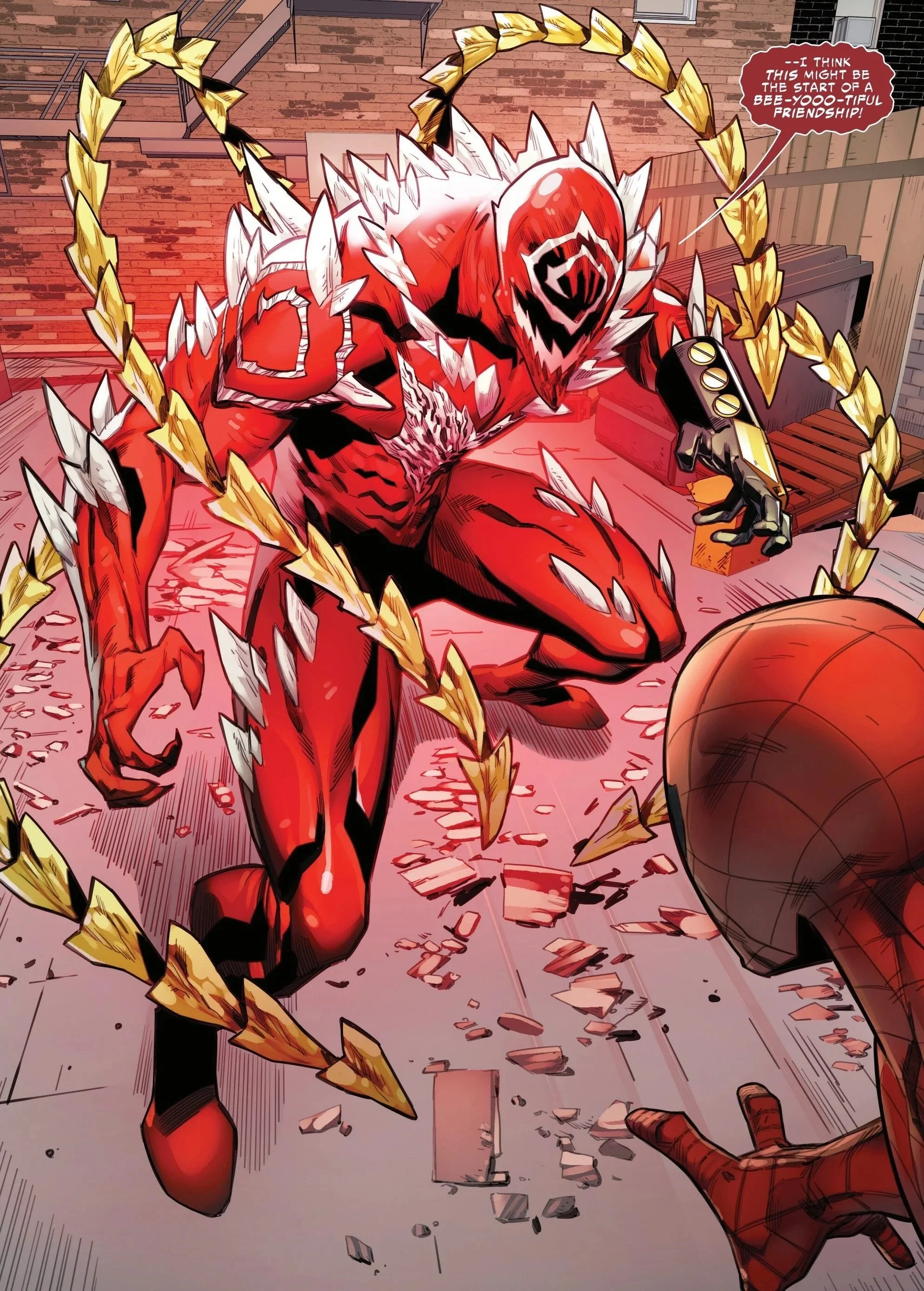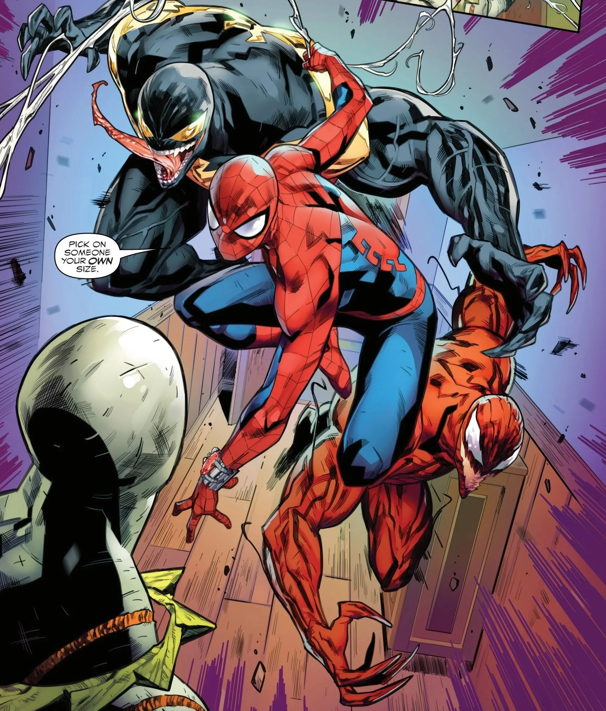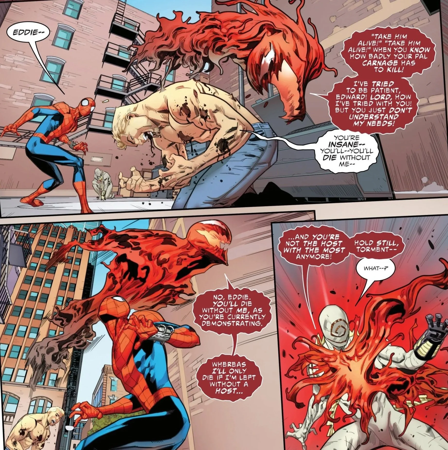 Slightly less so is Spidey’s reaction to Paul’s death, which while understandably conflicted, feels far more callous than I’d expect from even Peter to normally give. Mind you, we’re talking about a guy who was just a few issues back mourning the deaths of both Shocker and Eddie Brock’s father—two arguably far more problematic people than Paul could ever hope to be. There are moments where Peter is like “noooo, just hold on Paul” in the most seemingly “oh shucks, well that happened” kind of way (the art doesn’t help in this department either), and also the egregious bit where he’s literally like “Paul wasn’t my buddy, but he was a human being who did his best,” which feels wildly and unintentionally comedic with how it’s delivered. Like again, Spidey, you were literally calling the Shocker your good buddy two issues ago. Barring Peter’s wild out-of-place antics, the rest of him is on brand, as he tempers down his rage against senseless slaughter to try and bring Torment to justice. Very on-brand and, of course, true to character, that moral fortitude ends up causing more trouble than it’s worth in a situation like this. I’m pretty sure Carnage was having Maximum Carnage PTSD flashbacks at this point, because he really was sick of Peter’s “justice” lecture.