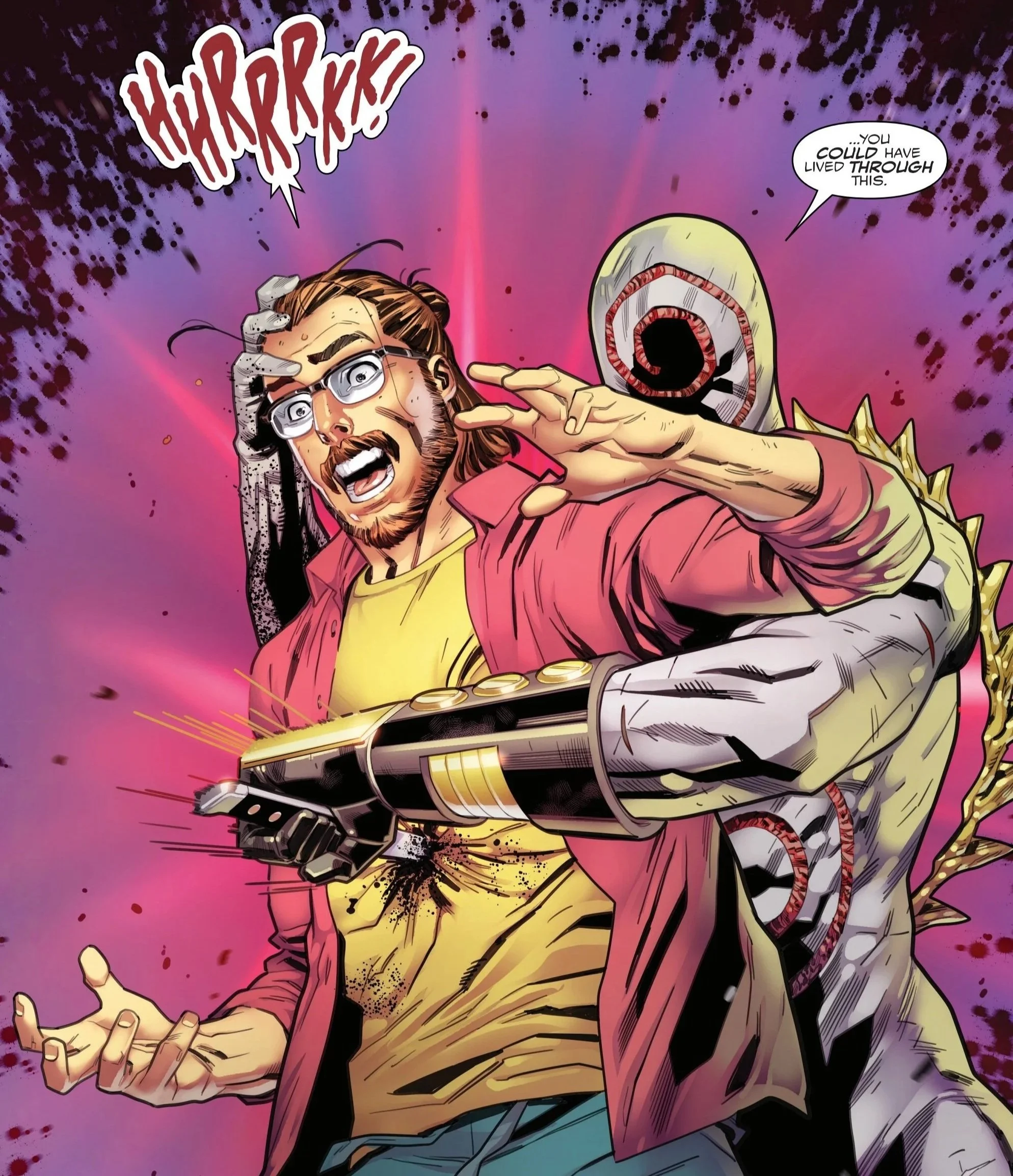 Honestly speaking, I really didn’t expect Al Ewing to pull off the real marquee moment of this book the way he did. Sure, I loved the little jabs that his run started taking at Paul, but they didn’t really amount to much of anything other than really petty, high-school-level taunts after a certain point. Sure, there were some real zingers, but the whole “meta” narrative of running Paul down really wore thin after the first two or three times you wring that towel dry. And yet here we are: Ewing gets the opportunity to kill off Paul Rabin—a guy who had the kind of nuclear levels of “go tf away” fan hatred that editors could only dream of—and makes it actually feel like an inciting incident. Not the death itself, mind you, since very few of us actually feel like this will be a permanent thing. But in the moment after, the number of wheels that start turning from this one incident is where the real beauty in Ewing’s narrative starts to work.