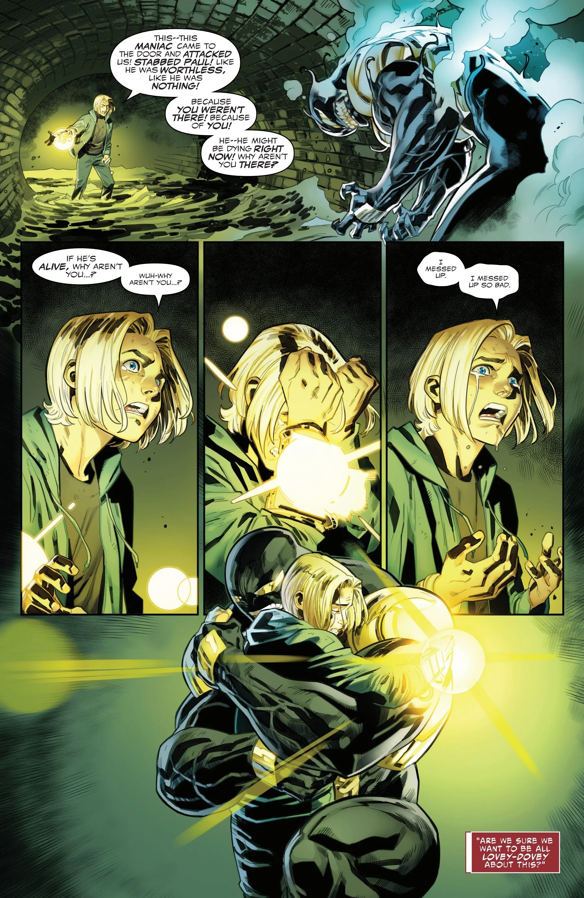 Speaking of symbiotes, this is a Venom book, right? Well, there’s not much Venom does here, but what little there is does matter. Dylan is the core focus for our characters—the ones trying to save him and the one trying to end him. It’s Venom who’s at the wheel for most of this book, and it’s a bit of a missed opportunity that MJ wasn’t the one primarily reacting to Paul’s death, but rather the symbiote. In either case, with the symbiote at the wheel, the main focus shifts to Dylan, and there’s a touchingly familiar moment when symbiote parent and son are reunited and Dylan allows himself to be vulnerable about Paul’s death (which he feels was his fault) to Venom. On the other end of the spectrum, Carnage is also feeding off Eddie’s impulses for revenge rather than looking for his son—but they seem to be more in sync with each other than, say, Venom was with MJ in the moment. I’m wondering if this will play into the narrative later on, that Eddie chose bloodshed over his own flesh and blood right then, but it’s an interesting dynamic bit to explore with just how much Carnage has influenced Eddie in both conscious and unconscious ways up till this point. Eddie is still his own man, and he demonstrates this aptly when he chooses to heed Peter’s words and avoid violence, but Carnage, true to his nature, was having none of that. All in all, you could say there were a lot… spiraling consequences that came out of Paul’s death. And everyone involved was feeling it.