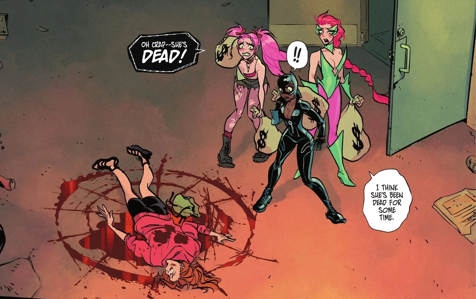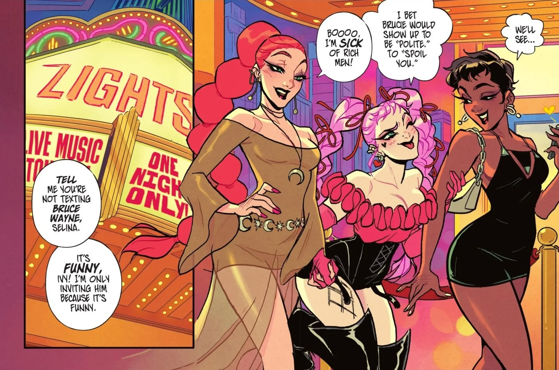 Harley is chaotic but sharp. Ivy is precise and principled. Selina moves comfortably between criminal instinct and moral restraint. Their banter feels lived-in rather than performative. Dinah serves as both outsider and moral counterweight, and the push and pull never feels forced.