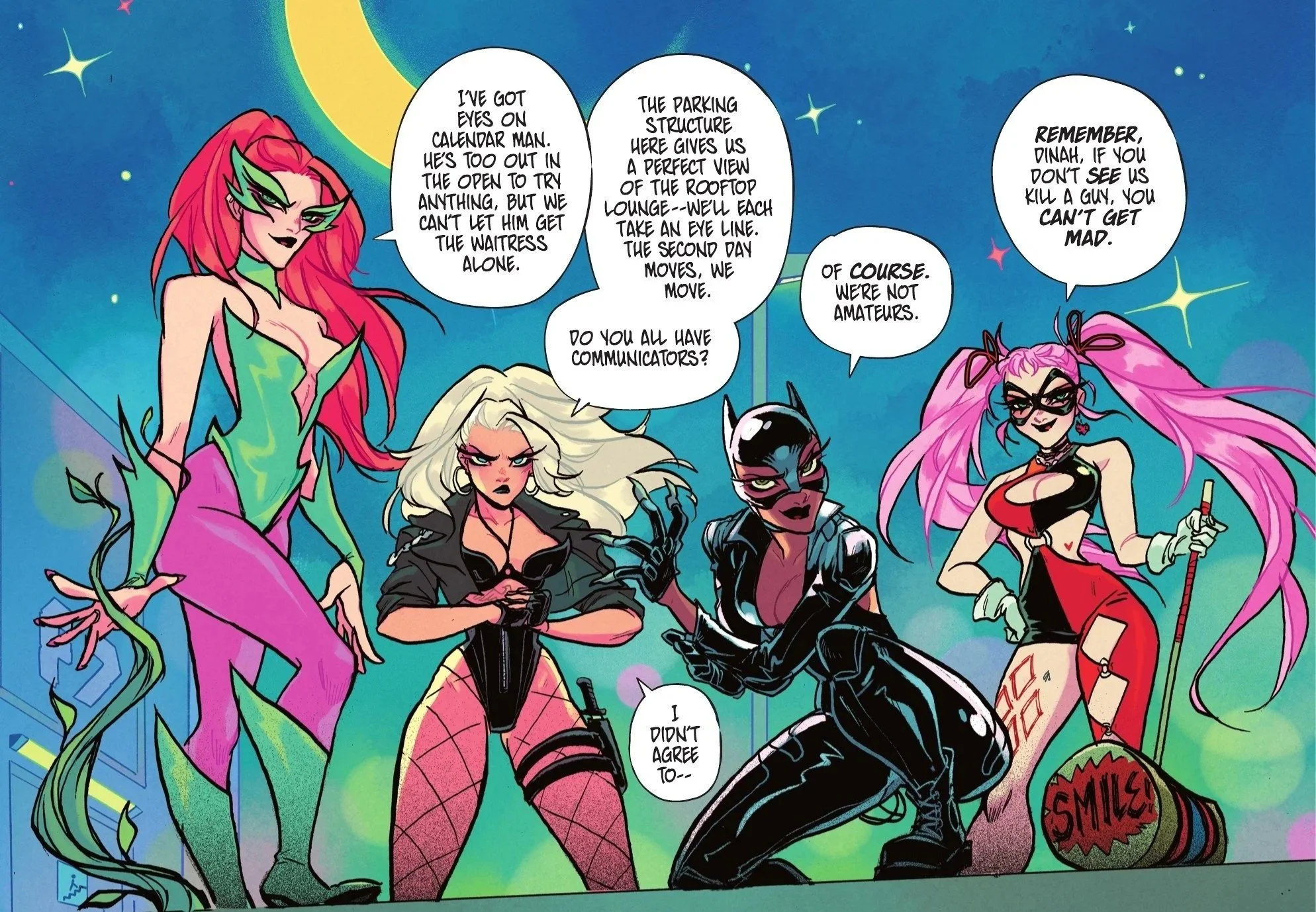 The next day, Black Canary is waiting to meet the Gotham City Sirens: Catwoman, Poison Ivy, and Harley Quinn. None of them were fully briefed on this team-up, and the early banter reflects that. The Sirens are wary of Dinah’s more traditional hero status, especially considering her engagement to Green Arrow. They do not want heroic oversight, and they definitely do not want Ollie hovering over their shoulders. Still, they find common ground in one shared belief: Gotham is not safe for women, and they are willing to do something about it.
