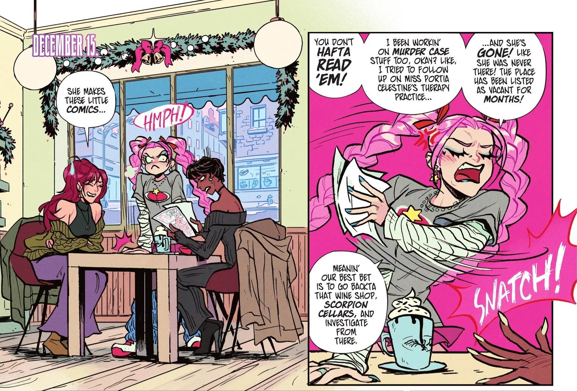 The opening café scene sets that tone perfectly. It’s playful, slightly chaotic, and driven almost entirely by personality. Harley’s comic timing, Ivy’s awkward deflection, and Selina’s quiet judgment all land because the book trusts those interactions to carry the moment.