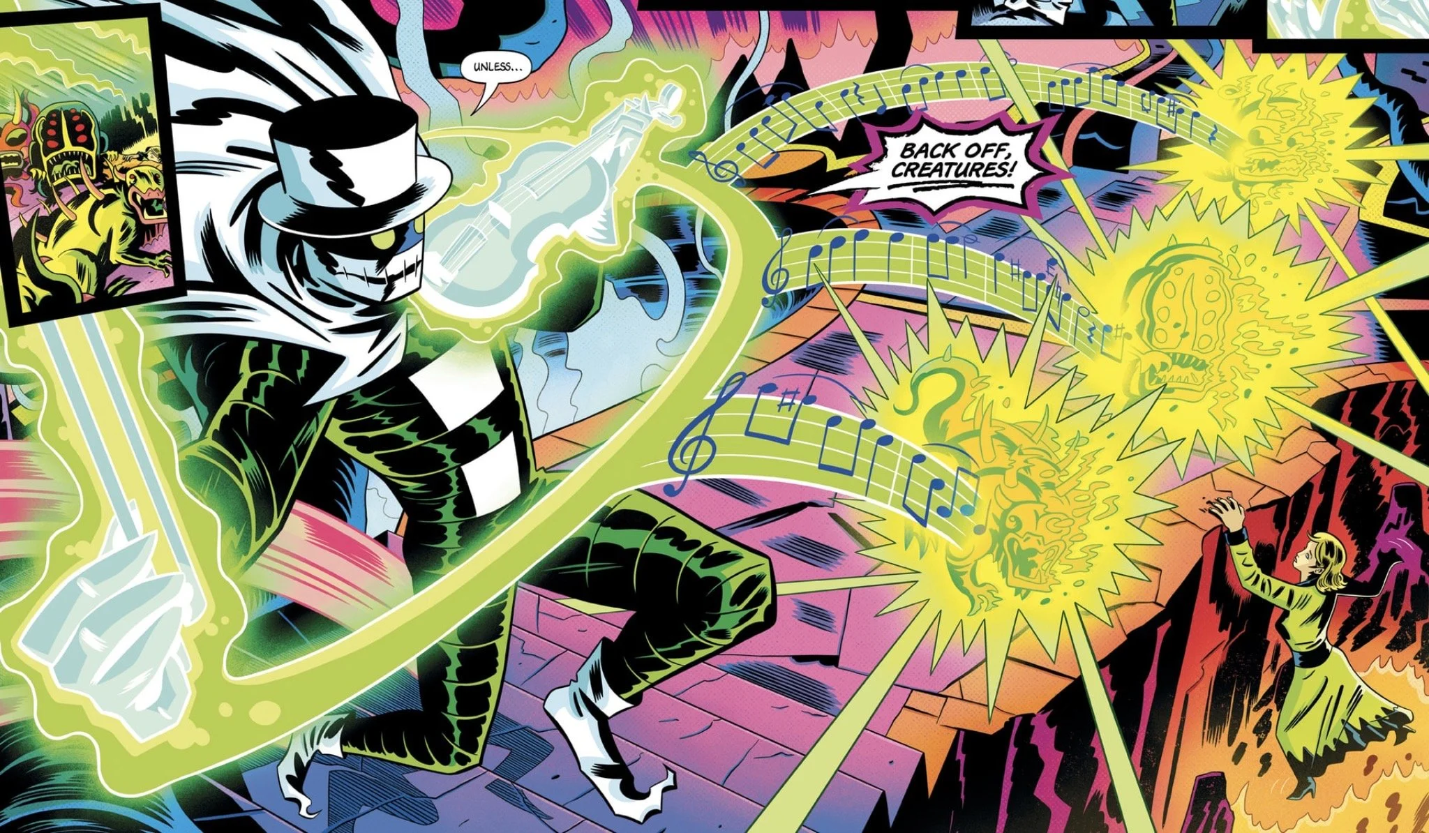We’re immediately greeted with the caption “Somewhere out of time and space…” in a colorful landscape that looks like the movie What Dreams May Come if Jack Kirby had done the art design. Erik and Katrina are reunited after what must have been a long time, but their happy reunion is quickly interrupted by a creature that resembles DC’s the Creeper, who bursts from the ground and grabs Erik’s leg!