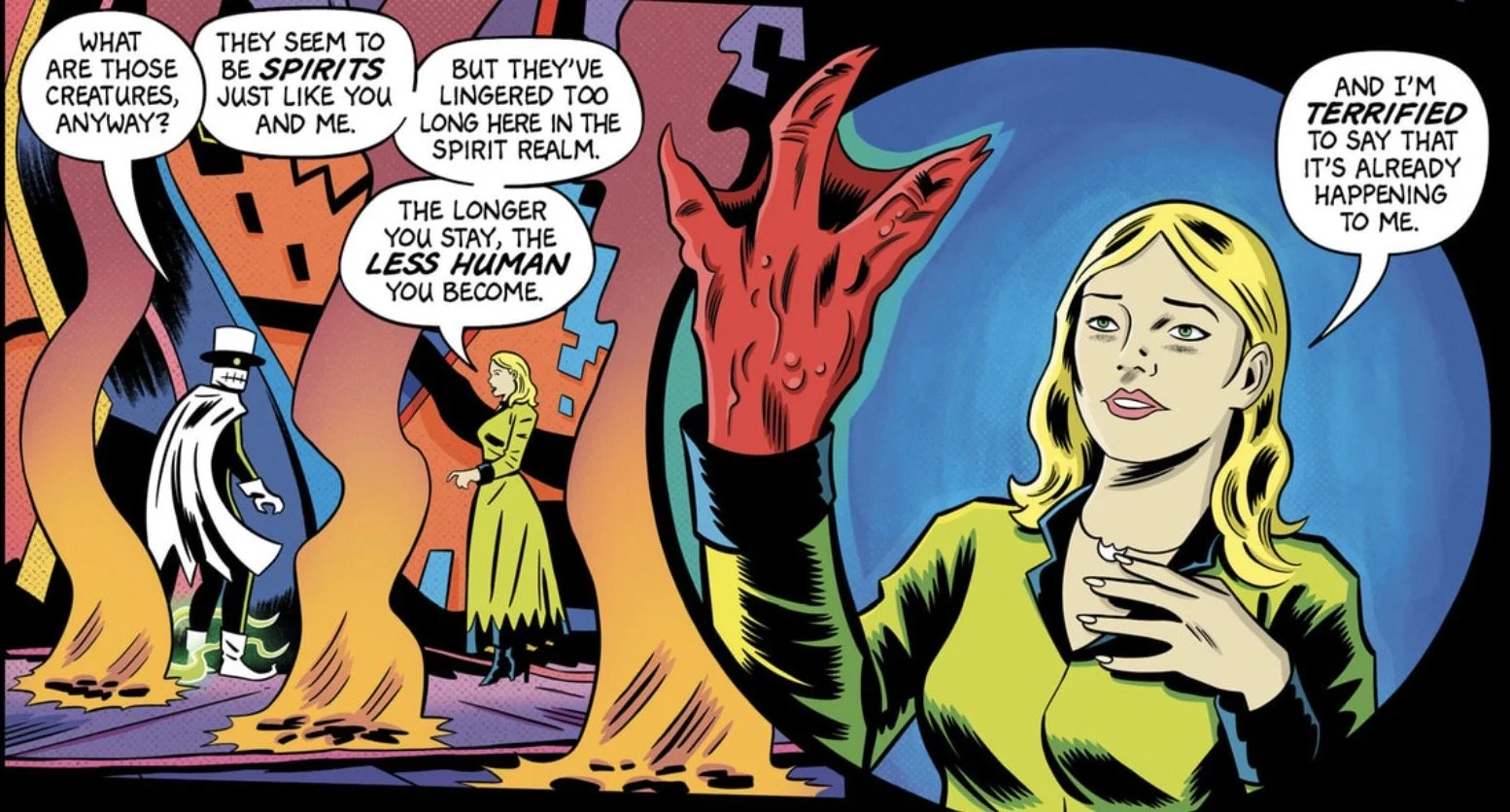 Meanwhile, in the land of the living, Dr. Hyde Perkins finishes burying Erik’s body (clad in the same bizarre cape-and-mask garb he wears in the Spirit Realm) and returns to Crescent Manor, which greets visitors with a sign reading “Beware the Spirit of the Shadows.” Soon, he has a visitor, and the nature of his relationship with Erik starts to become clear. Are these two men, now separated by life and death, the heroes of this tale, or are they themselves villains?
