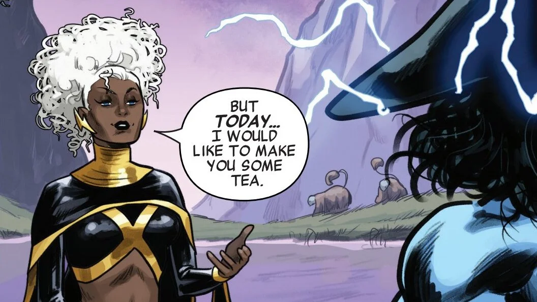 Storm answers this call to action by offering something entirely unexpected—she offers the god some tea.