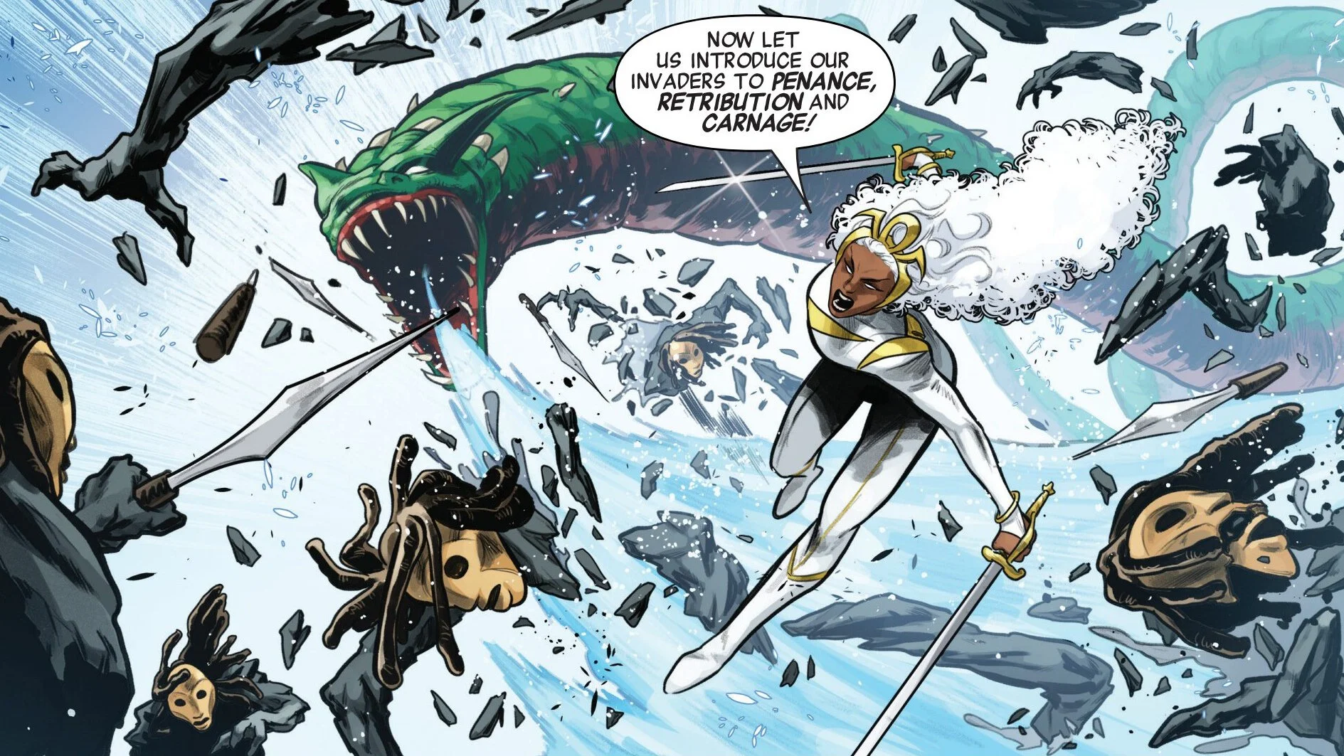 Back to Storm, she is seen riding the serpent god Sugaar as they discuss her battle with Susanoo, a conflict where she received assistance from the Avengers. Because of Storm's vow to never take a life, the Avengers have decided to imprison Susanoo within a pocket dimension. This ensures he cannot harm Earth while sparing him from the death he craves—though he is far from grateful. He screams that Storm "knows no honor," feeling his chance at a warrior's end has been stolen.