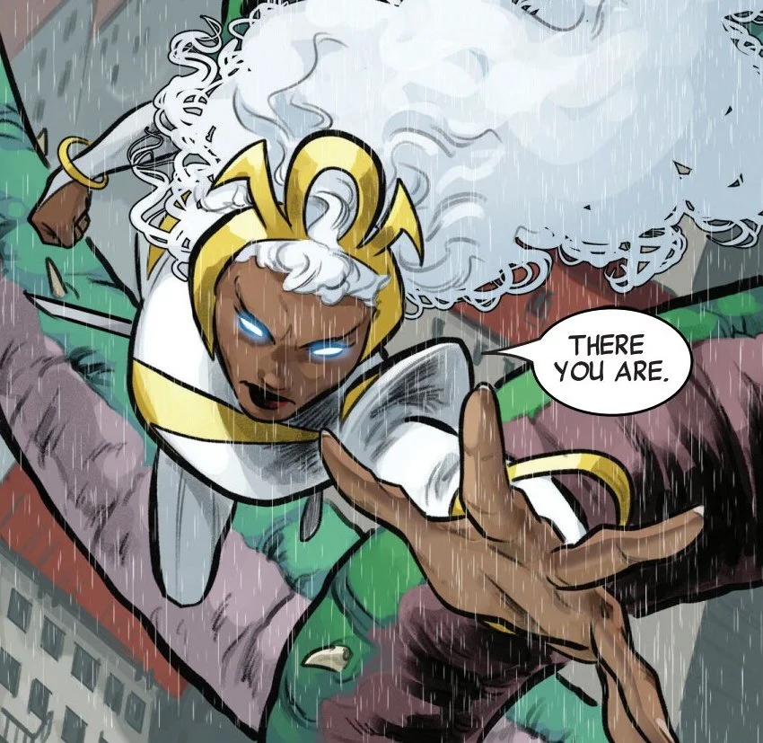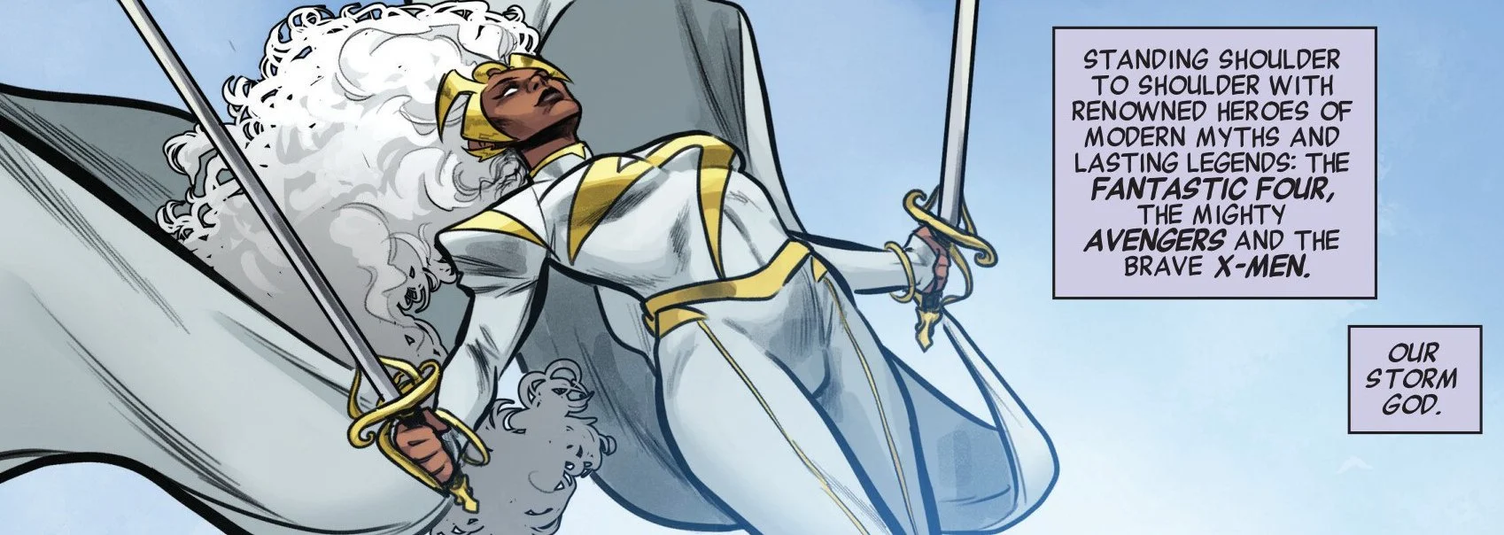 This story kicks off with a recap showing Storm facing other thunder gods from the "Thunder War" arc and emerging victorious. We see multiple examples of the type of god Storm has become: a deity who will even aid those who oppose her goals, like Orchis, to ensure their protection.