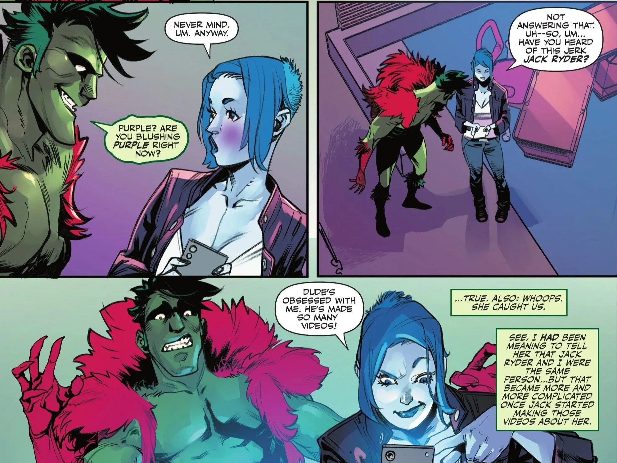 Further complicating matters, Livewire pitches an idea for their next guest: Jack Ryder! The Creeper immediately starts to freak out as Livewire points out that Ryder seems obsessed with her. She shows Creeper videos of his alter ego disparaging her—insulting her looks, and even her use of pronouns.