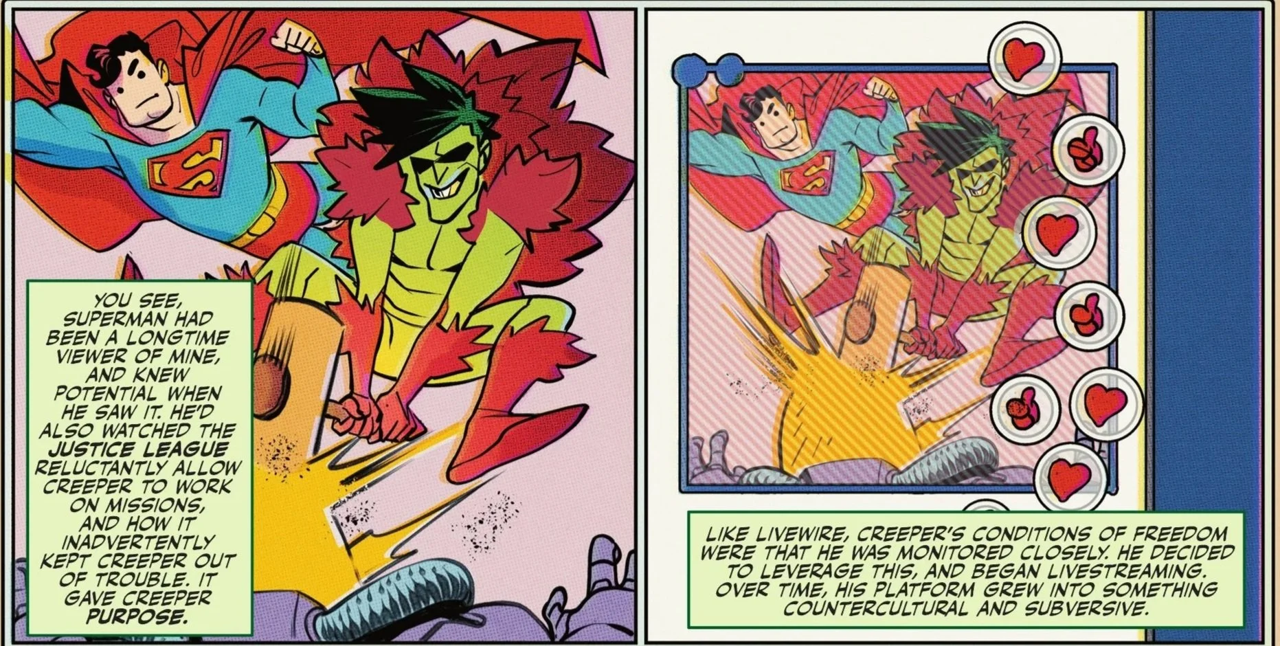 The Creeper’s live chat stream sounds off as she explains how she was young, reckless, and picked a fight with Superman in addition to a life of crime. Unbeknownst to Livewire, however, Creeper is broadcasting her story to his own audience, giving her massive exposure. Hours pass as the two continue talking on-air; Livewire explains her disdain for superheroes in general, arguing they are just as bad as the villains given how much they endanger the public. Creeper chimes in, agreeing with her as he complains that Superman can wear his underwear on the outside and be called a hero—but when he does it, he isn’t allowed within 500 feet of an elementary school.