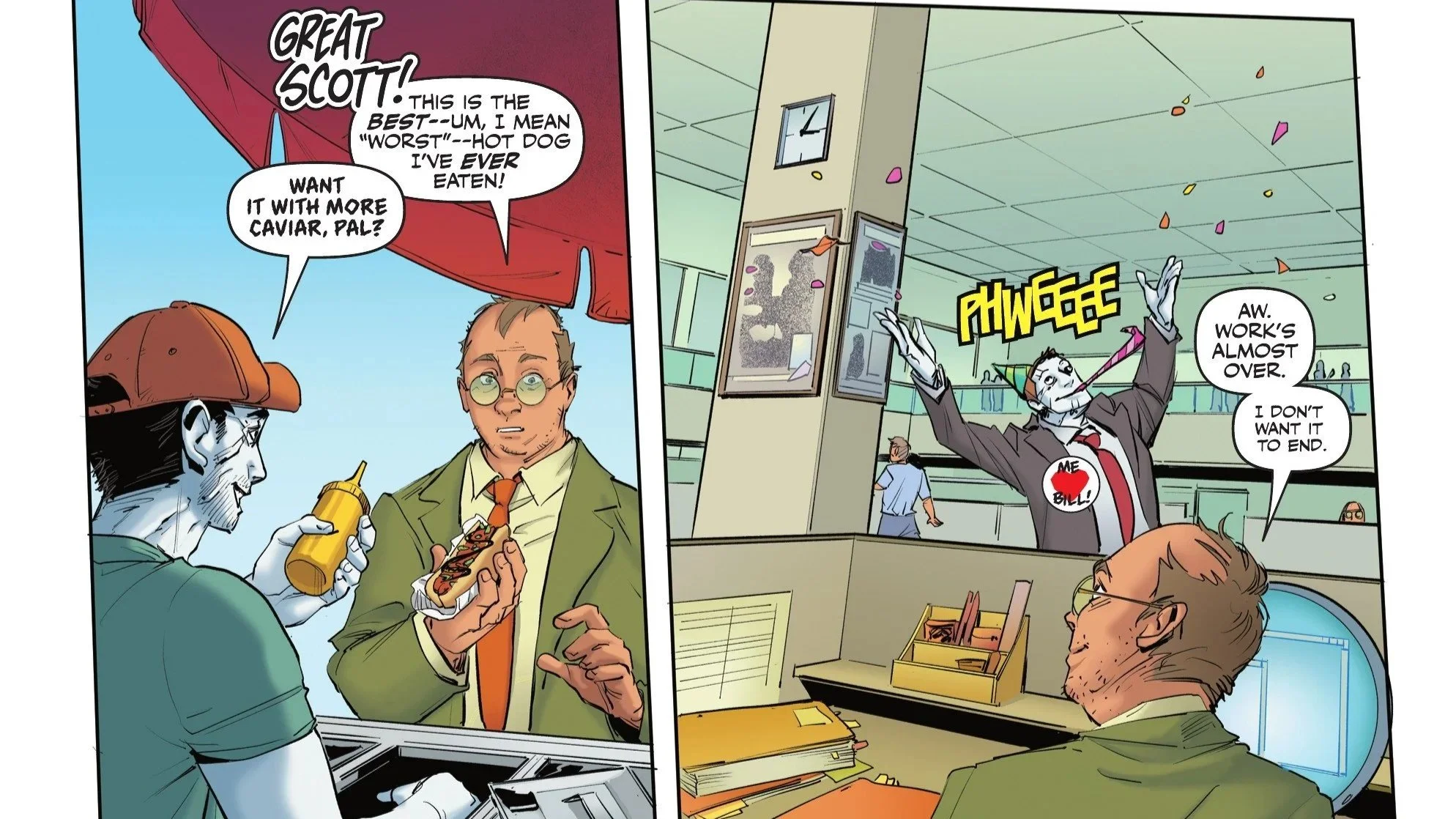 Starting to get the hang of Bizarro-speak, Bill quickly corrects himself and tells his boss to "go to hell." This prompts a wide smile from the boss, who immediately tells Bill to take a long lunch on the company dime. Bill visits the Bizarro hot dog vendor, who apparently serves the best hot dog ever—even offering it topped with caviar. Bill eventually returns to "work," if you can even call it that, as his boss marches around wearing a party hat and throwing confetti. At this point, Bill doesn’t even want to leave.
