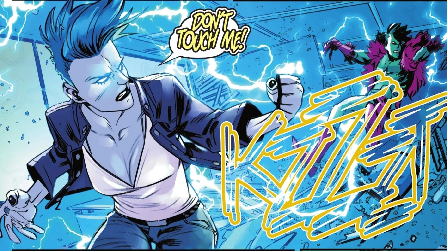 This shocks the former supervillain; she sits stunned, processing what she just heard before eventually blowing up—quite literally! As The Creeper reaches out to grab Livewire, she instinctively lashes out with her electric powers, sending him flying. She accuses him of being a liar, claiming he only used her to "farm content" for his primary show.