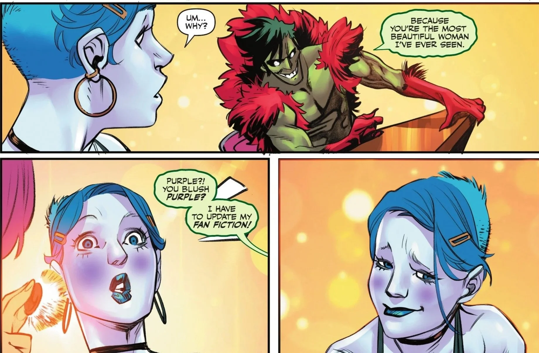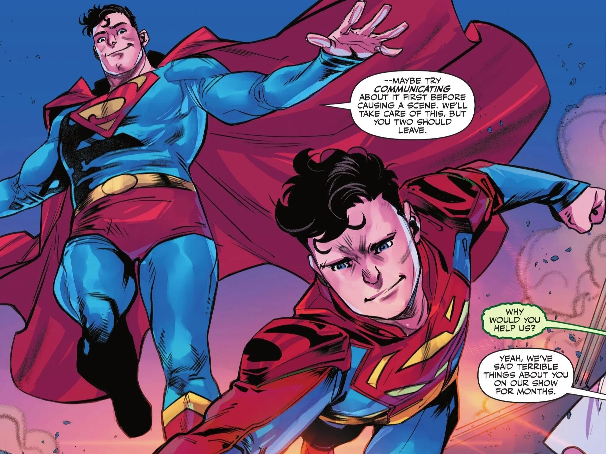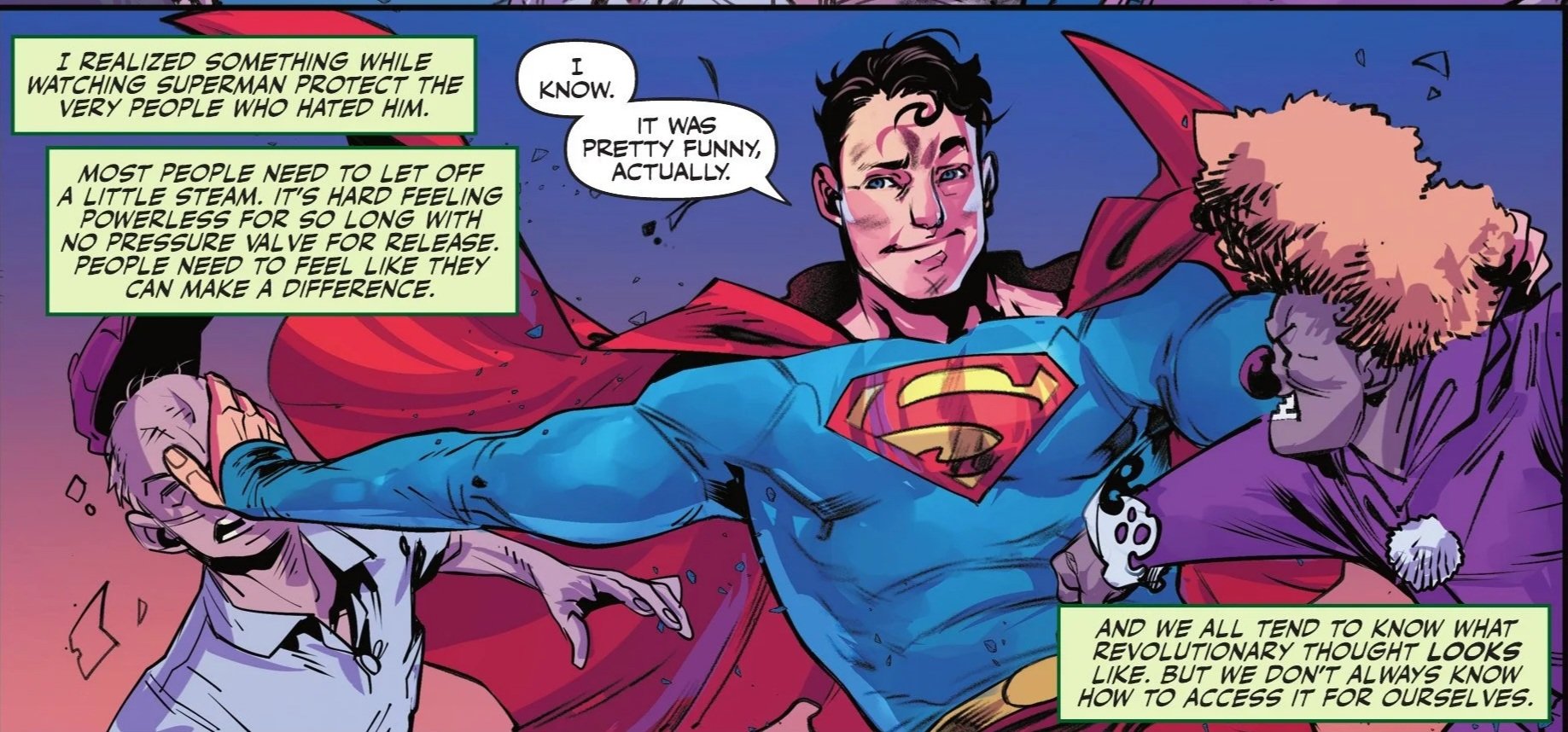 Creeper doesn't argue, though he insists that no one can ever know he is also Jack Ryder. She playfully agrees, noting she’d be embarrassed to be associated with Ryder publicly, but privately is another matter entirely. The two prepare to take their leave just as both Superman and his son, Jon Kent (the "other" Superman—which will never not be amusing), arrive on the scene to finally quell the rioting fans.