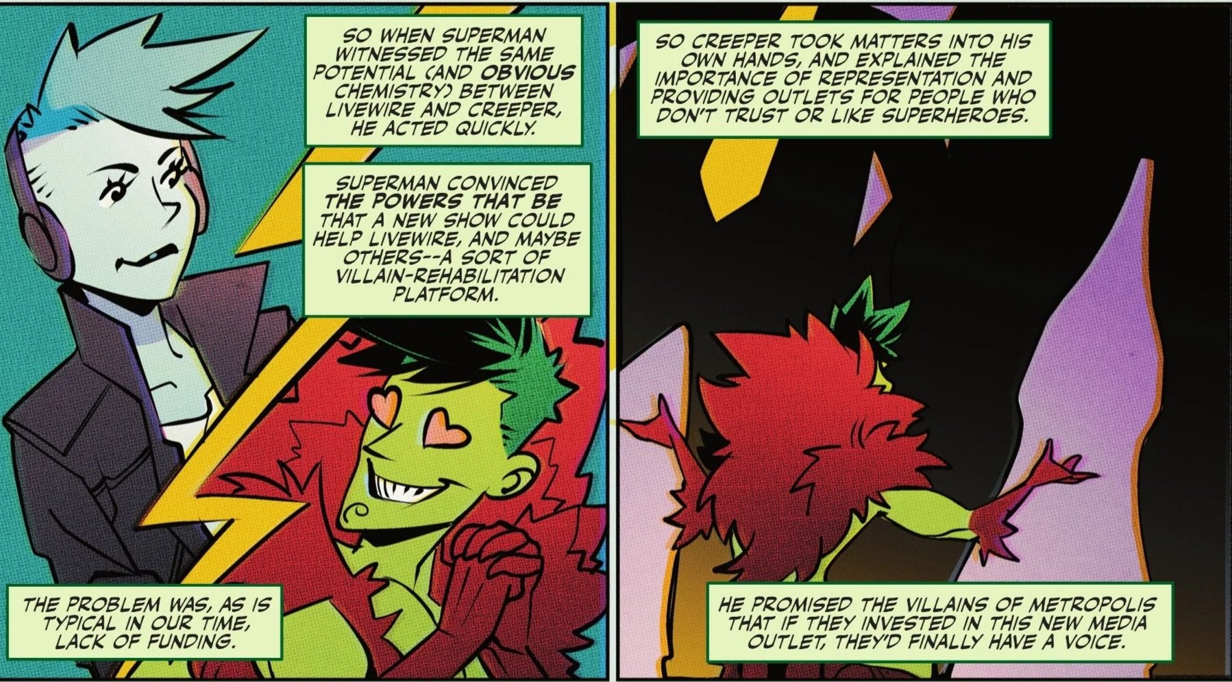 Seeing Livewire come from a background so similar to his own, Creeper implored Superman that a show spearheaded by her could potentially open the door for other villains to seek redemption. But he didn’t stop there. He reveals how he sought funding from Metropolis's underworld to bankroll a show that would serve as an outlet for those who distrust superheroes. Hilariously, Creeper also went to the Justice League and told them the show would allow them to monitor anti-hero sentiment—effectively dropping a "super-psyop" on Metropolis.