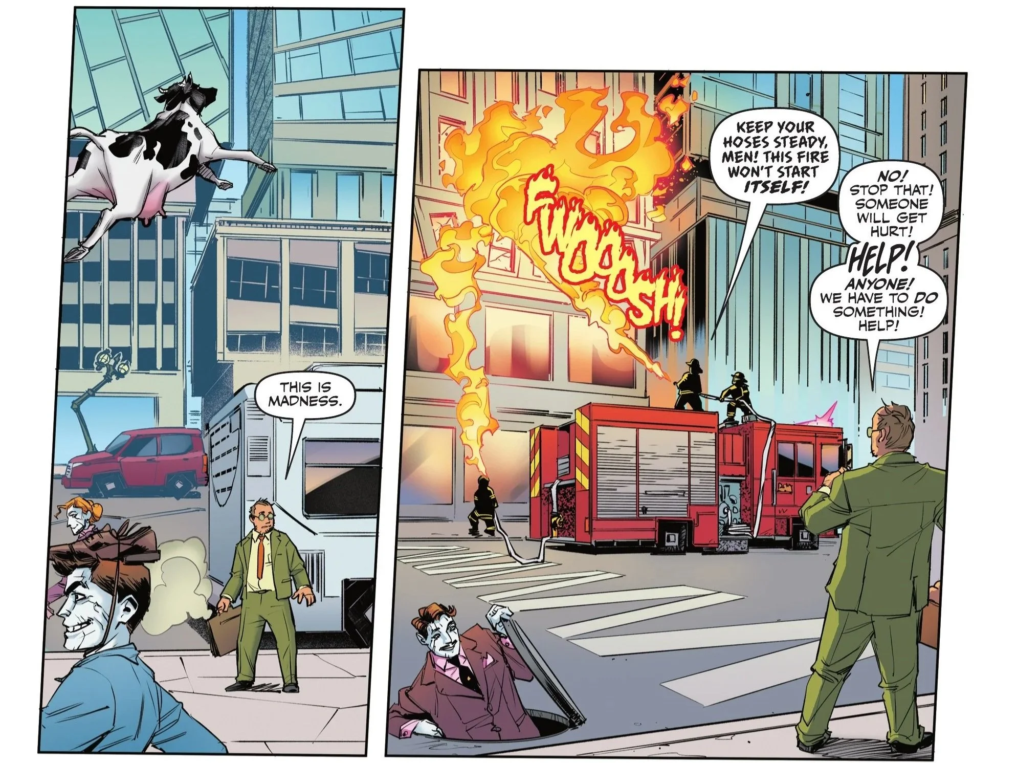 Bill attempts to go about his daily routine, slowly acclimating to the opposite societal norms of Bizarro World in hilarious fashion. This time, the commute is pleasant, as the bus inexplicably features built-in massage seating. Upon arriving at the Bizarro World version of the Daily Planet, he witnesses literal cows flying, a man wearing shoes on his head, someone climbing down into a sewer, and firefighters literally starting fires. As Bill freaks out, he’s suddenly accosted by an armed mugger who tells him to "yell louder" before sticking him up—by forcing all of his money onto Bill instead of taking it.