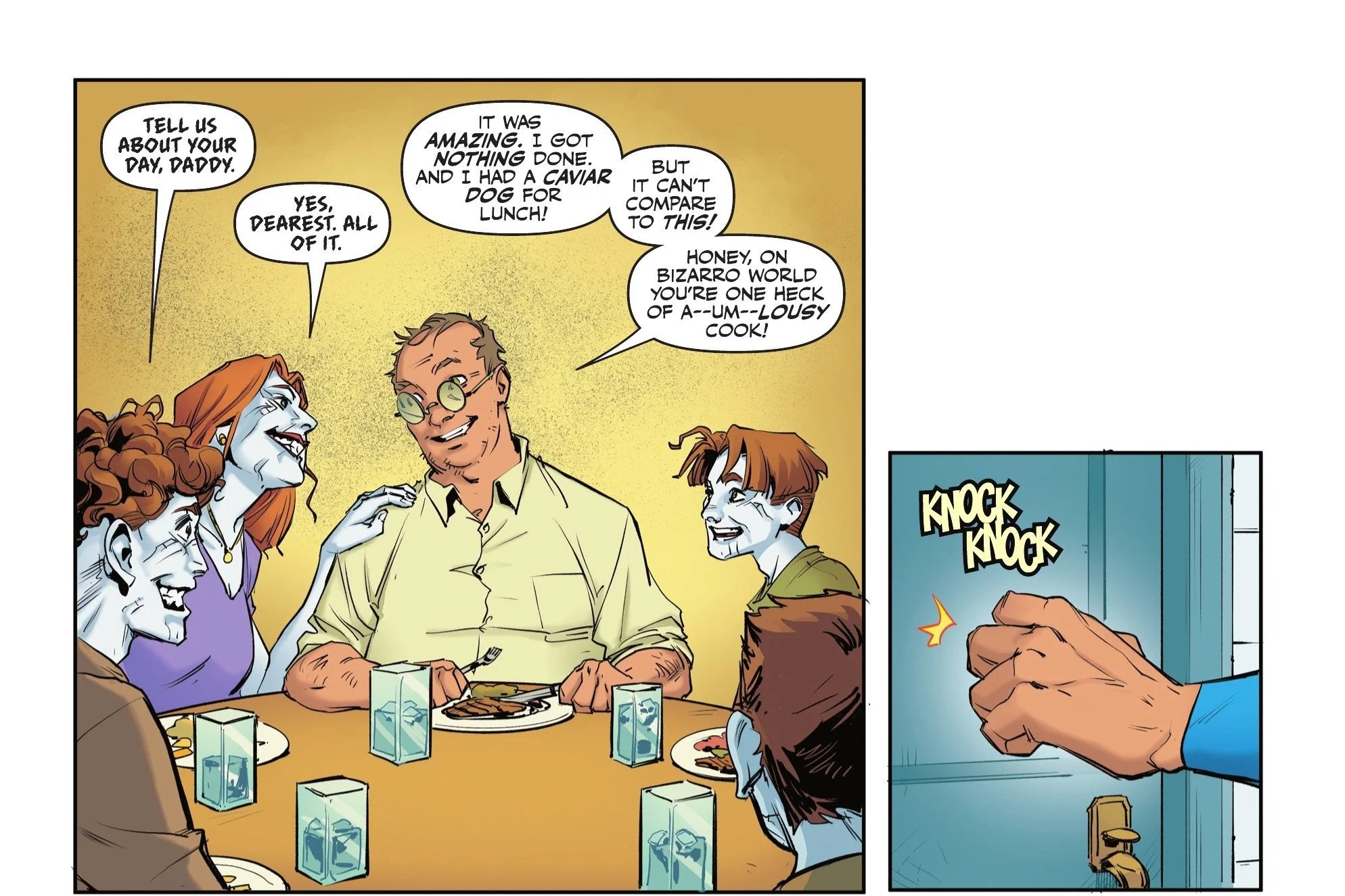 Bill heads back home, surrounded for once by an enthusiastic and loving family who are genuinely excited about his workday. He tells them about his caviar dog and informs his Bizarro wife that she is "one heck of a lousy cook" (a high compliment!) before a knock at the door grabs his attention. Bill happily gets up to answer, only to find Superman himself standing on the porch.