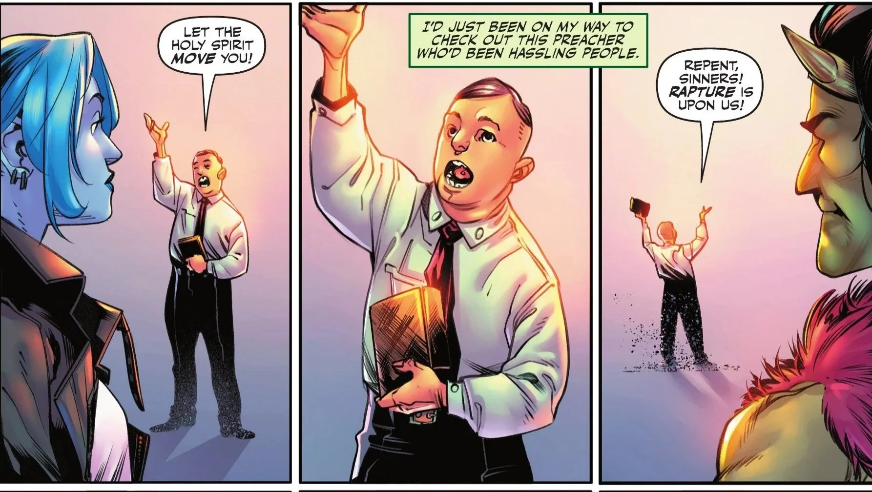 It’s here that she and The Creeper cross paths, as both run afoul of the street preacher shouting at passersby. The Creeper attracts his own share of stares while preparing to film himself confronting the preacher—sporting a pair of devil horns for good measure. The preacher accosts Livewire, praying aloud for the means to heal the “blue-haired Jezebel.”
