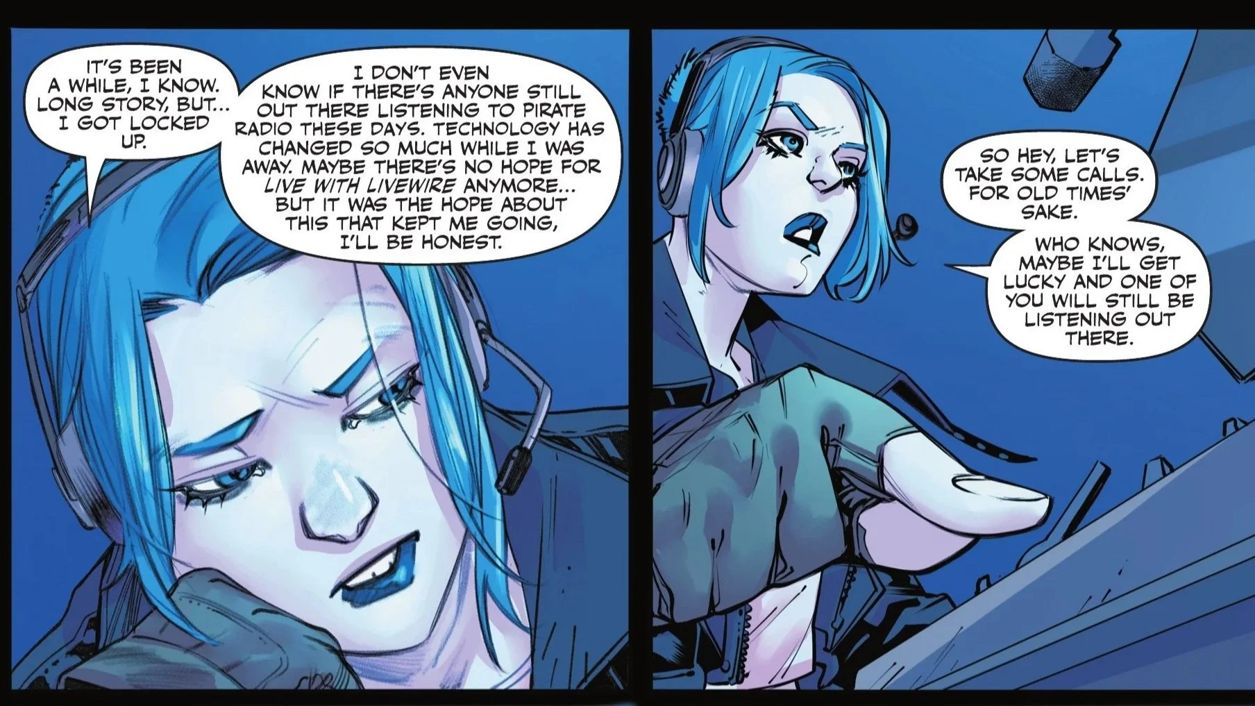 Livewire leaves the two behind as she returns to her secret pad, which has remained surprisingly undiscovered and undisturbed. She enters her home, relieved to see that her shock-jock equipment is still intact, and decides to get back on the air. She laments being unsure if anyone even bothers to listen to pirate radio these days—after all, she’s been away for a long time and technology has certainly changed—but she decides to take calls for old times’ sake, hoping to find a listener.