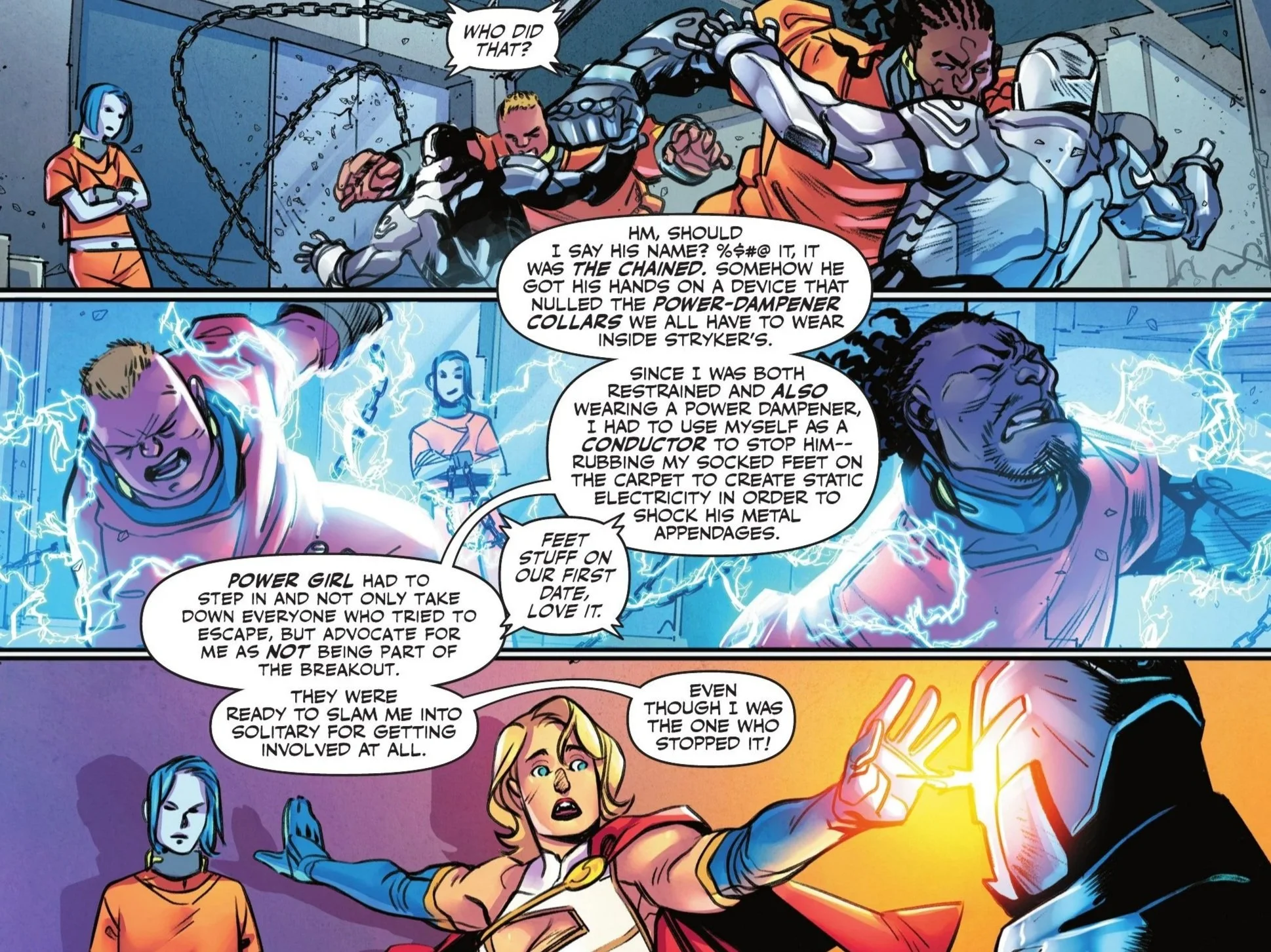 Apparently, the incarcerated villain The Chained somehow nullified the power-dampening collars all the inmates wear on Stryker’s Island, which led to a breakout attempt. Instead of participating, Livewire used her powers to pacify the inmates, rubbing her socked feet on the carpet to generate enough static electricity to shock his metal appendages. This elicits a foot-fetish joke from the caller, and I’m sure you can guess exactly who that is.