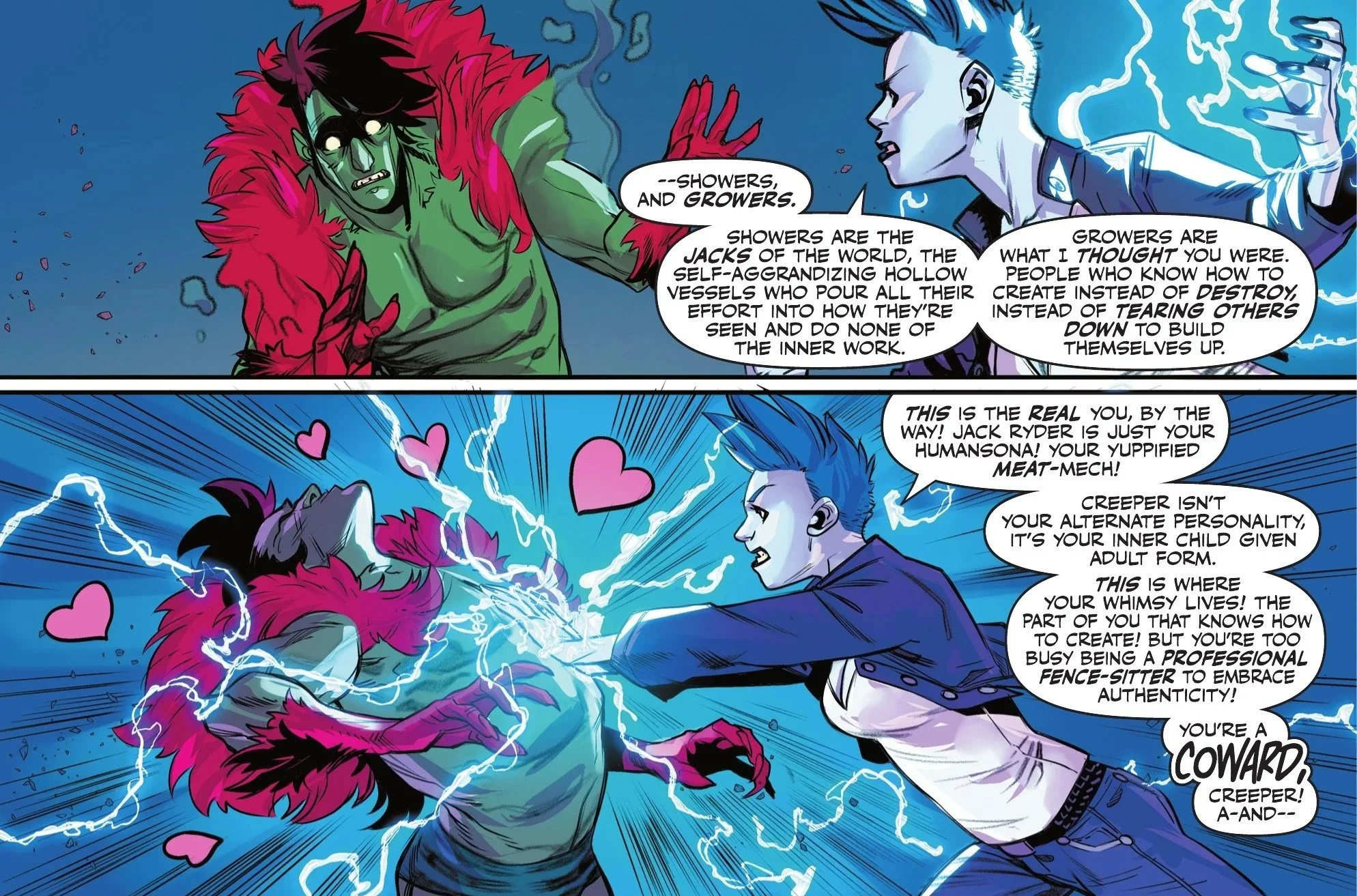 Creeper, to his credit, tries to explain his feelings using a rather macabre—but ultimately adorable—metaphor involving an "ant death spiral." Livewire isn’t having it and proceeds to kick him where it hurts. Yeah, that checks out. Heartbroken, she continues to shout at Creeper, calling him a coward for being unwilling to embrace his authentic self. She admits she genuinely liked him, but that the trust is now ruined.