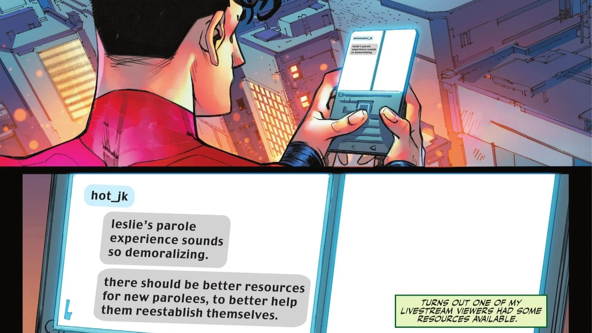 During the stream, we find out that one of the listeners is actually Superman—not Clark, but his son, Jon Kent. Jon, moved by Livewire’s story, reaches out to her about a week later, even picking up the tab for her groceries. She stubbornly refuses to thank him, however, insisting that she never asked for his help.