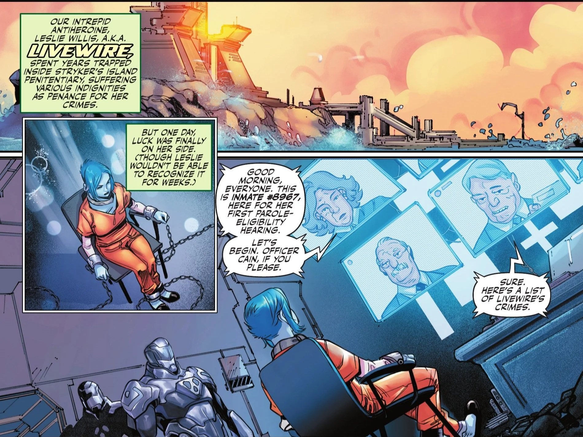 As we fixate on Creeper’s… well, creepy smile, the clock rewinds three months. Within two panels, we’re watching Leslie Willis (aka Livewire) receiving a cavity search, which effectively sets the tone for the entire book. Livewire is in prison and wearing a power inhibitor collar as a guard informs her that her parole hearing is scheduled in twenty minutes—with the judge video-conferencing in. Insulted that the judge can’t even physically be present, Livewire retorts that she has been a model prisoner without a single behavioral violation in years. The guard couldn’t care less, however, stating that everyone has better things to do than deal with her, leaving the electricity-based villain alone to get dressed.