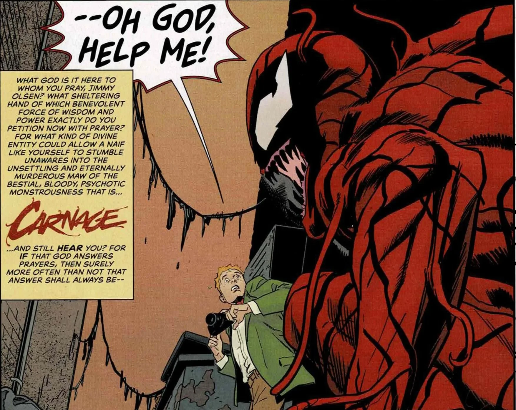 Jimmy Olsen facing off against Carnage is already a ridiculous premise, and the story leans into that absurdity without hesitation. The humor lands consistently, and it never feels like it is trying too hard to be clever.