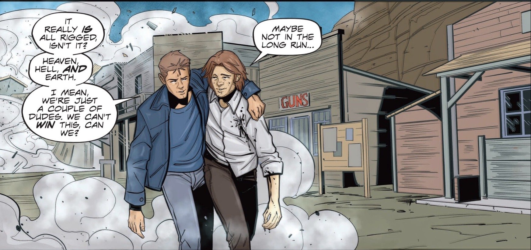 Before long, they find themselves pursued and ultimately captured by zombie cowboys riding on giant jackalopes. That is a new one. They are led to a Western town and taken to the courthouse, where they are put on trial before an undead judge and a jury full of ghouls. Their accuser is Steff Windler, who quickly buys off the judge and jury with promises of rewriting history so that they can finally rest, as long as her curse is transferred to the saintly Winchester brothers.
